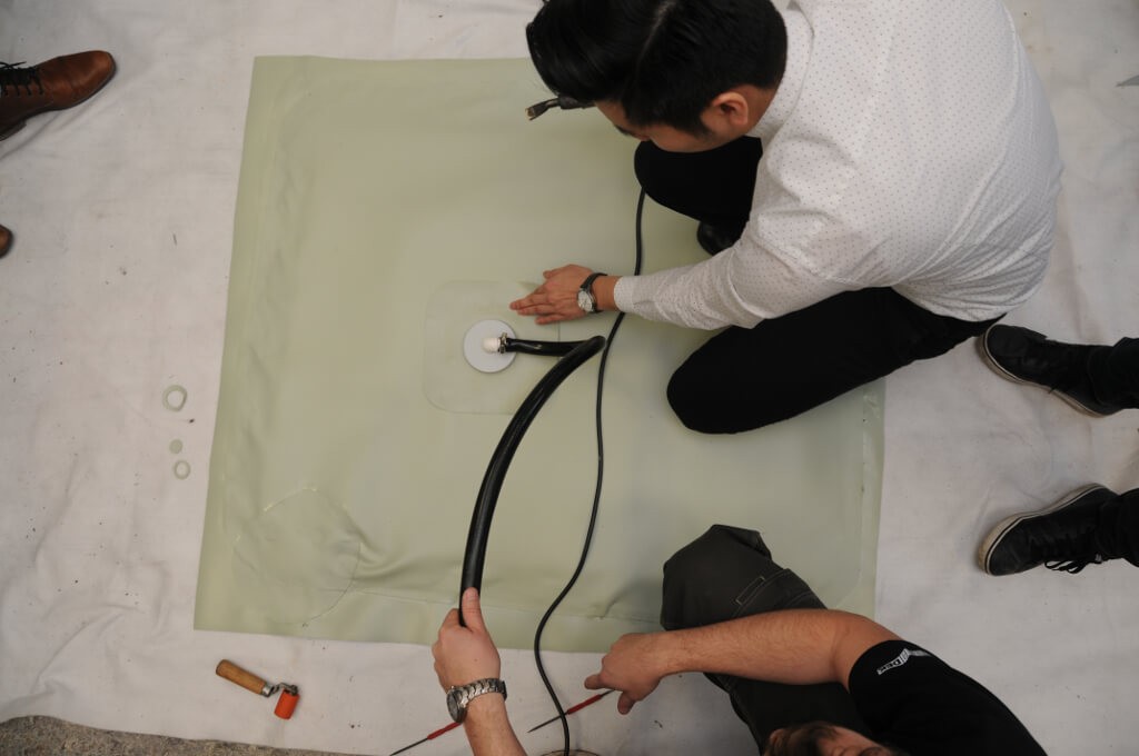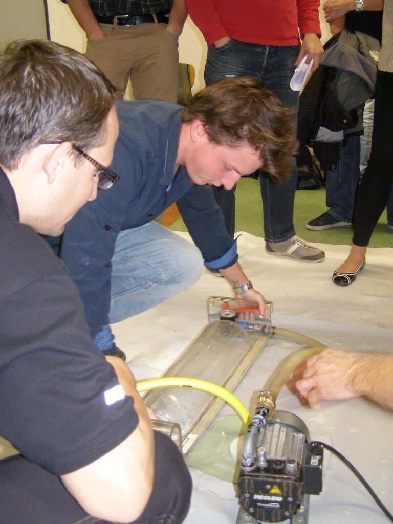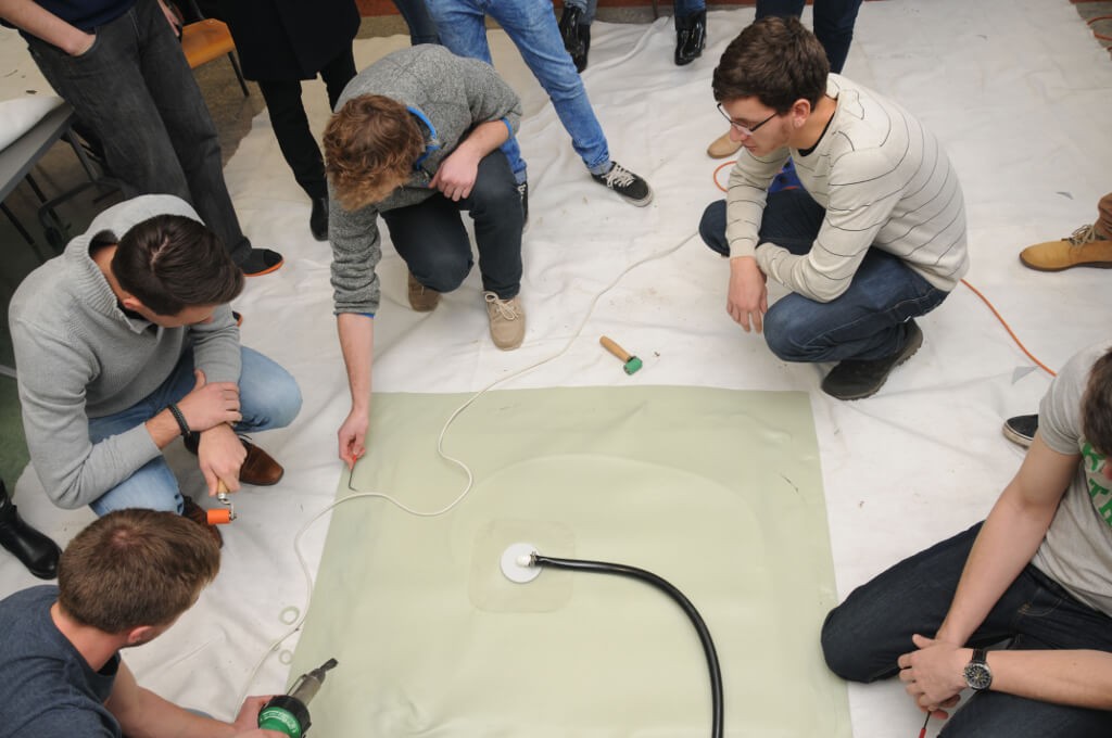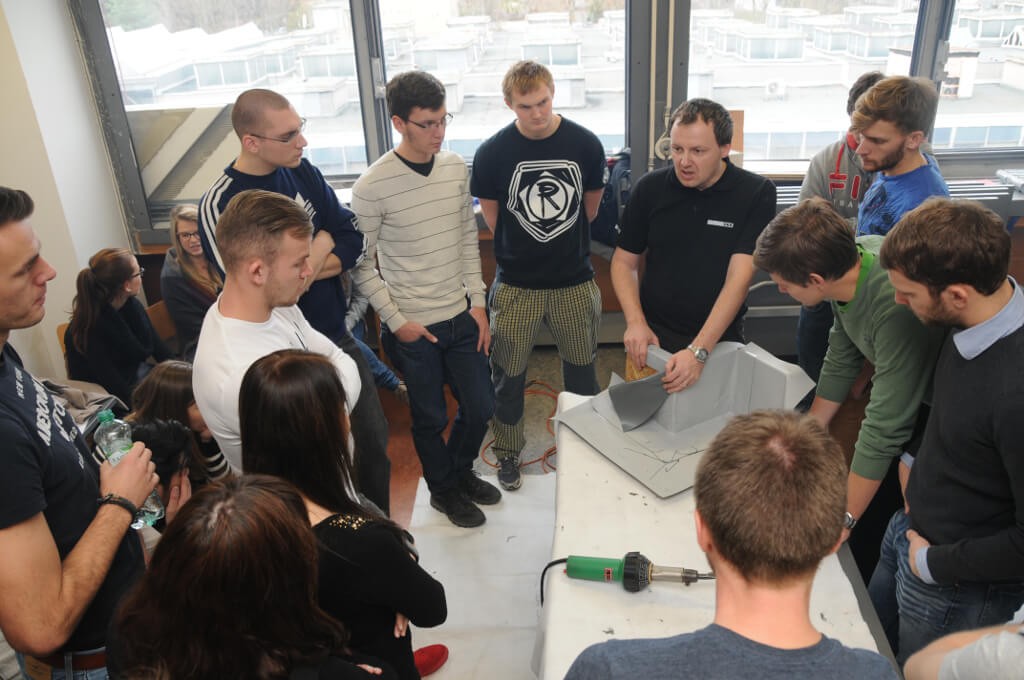 Největší ohlas mají naše přednášky ve spojení s praktickými ukázkami zpracování určitých materiálových skupin. Na takovou formu výuky se výrazně soustřeďuje Katedra technologie staveb Fakulty stavební ČVUT v Praze pod vedením Doc. Ing. Pavla Svobody, CSc. Ten do svých přednášek předmětu Management kontroly staveb již několikrát pozval Ing. Luboše Káně, Ph.D. s výkladem zásad realizace, kontroly provedení a kontroly těsnosti hydroizolačních povlaků a s rozborem příčin poruch hydroizolací. Zájem byl také o výklad principů návrhu a posuzování hydroizolací podle směrnice ČHIS 01 vydané Českou hydroizolační společností ČSSI. Na přednášky Ing. Káně navázala cvičení, kde pražští technici ATELIERU DEK Jan Karásek, Josef Kurka a Ing. Libor Koubek studentům předvedli ukázky zpracování hydroizolačních fólií. Některé z technologických operací si studenti sami vyzkoušeli. Poté si v souladu s náplní předmětu na svých vlastních spojích i na detailech vytvořených našimi techniky sami vyzkoušeli nejobvyklejší metody kontroly provedení a těsnosti. Z fotografií je patrné, že každý měl možnost držet v ruce kromě svařovacího agregátu také kontrolní jehlu i vakuový zvon napojený na vývěvu a každý se podílel na vytvoření a kontrole těsnosti sektoru dvojité hydroizolace. Vyučující hodnotí zapojení našich praktických ukázek do výuky velmi pozitivně. U zkoušek prý studenti odpovídají bez zaváhání i na záludné otázky týkající se technologií a kontrolních metod, které si sami vlastníma rukama „osahali“. A ještě kontrolní otázka: Víte, proč v praktických ukázkách předvádíme zhotovení a kontrolu fóliové hydroizolace a zpracování asfaltových pásů ukazujeme pouze na fotografiích a krátkých videích? Odpověď je snadná, na pražské stavební fakultě je velmi citlivé požární zabezpečení, a to samozřejmě nerozlišuje zdroj kouře nebo tepla. Vůbec nestojíme o osprchování samočinným hasicím zařízením v průběhu výuky.