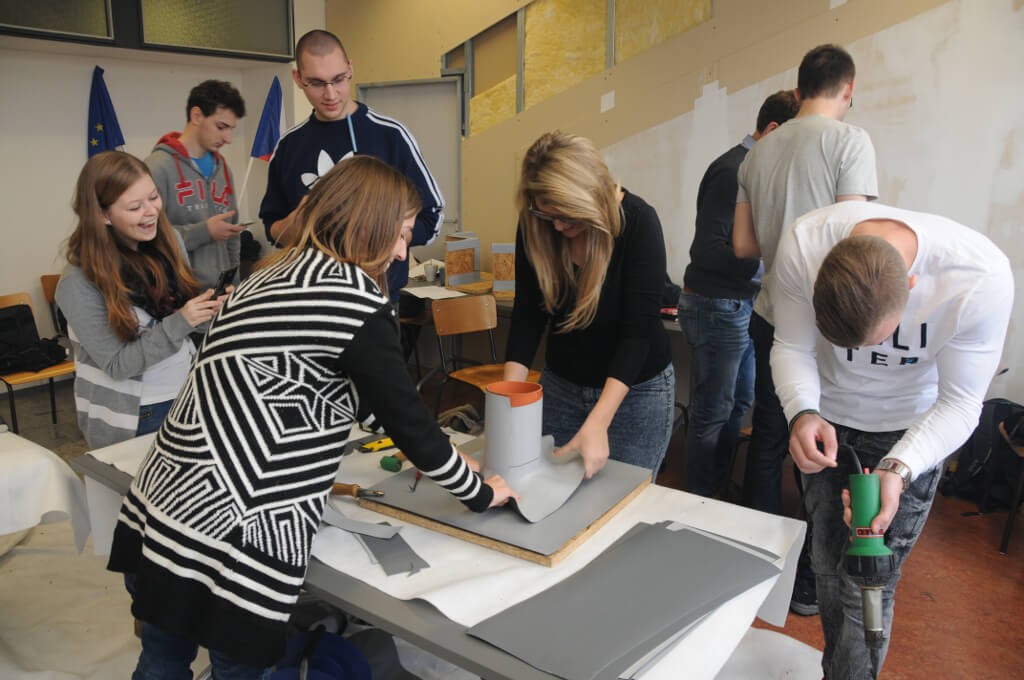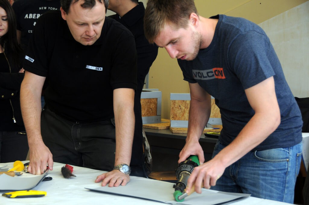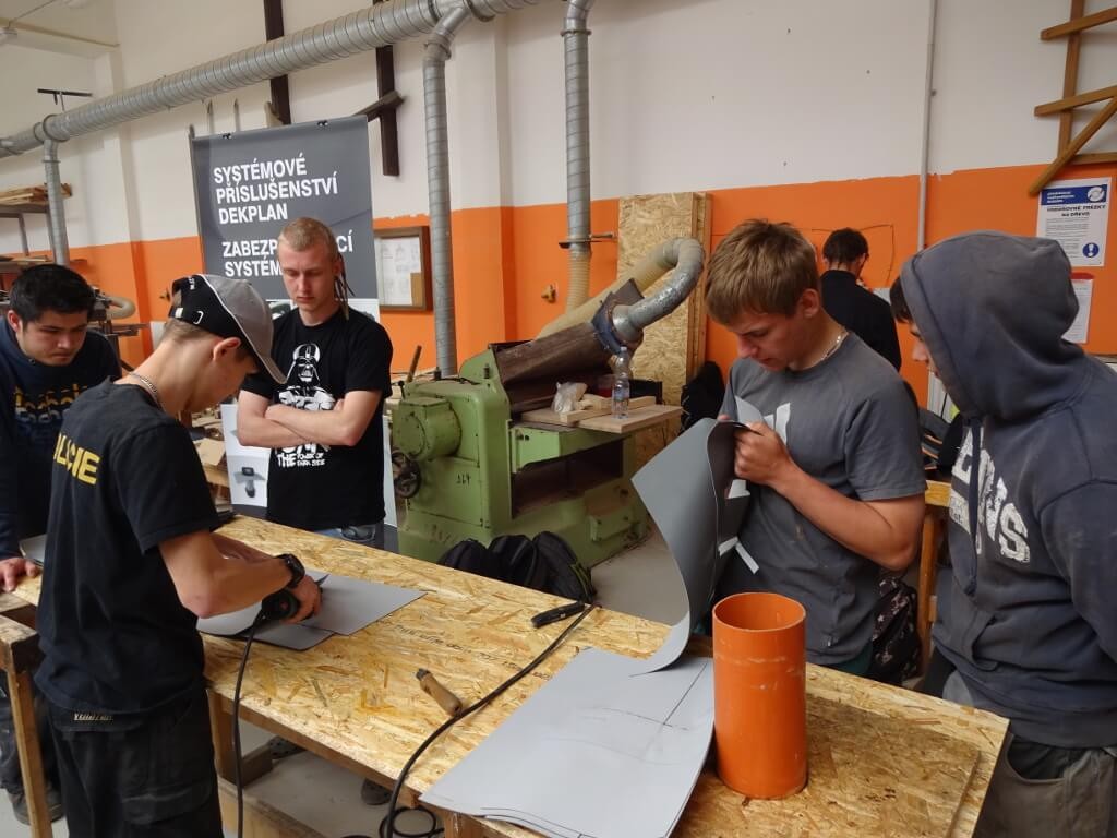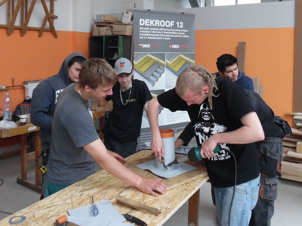 Nutno ale dodat, že budoucí zhotovitele, kteří vyjdou například ze SOU Bosonohy nebo SOU a SOŠ Vyškov, nenachytají. Ti si s velkým zájmem vyzkoušeli svařování hydroizolačních fólií DEKPLAN a opracování střešních detailů pod dohledem našeho školitele Roberta Mráčka a teoretickou “nalejvárnu” dostali od brněnských techniků Ing. Roberta Kokty a Ing. Martina Klimeše. Na obou učilištích jsme byli pozitivně překvapeni velmi aktivním přístupem posluchačů k praktickým ukázkám, svařovací agregáty šly z ruky do ruky.