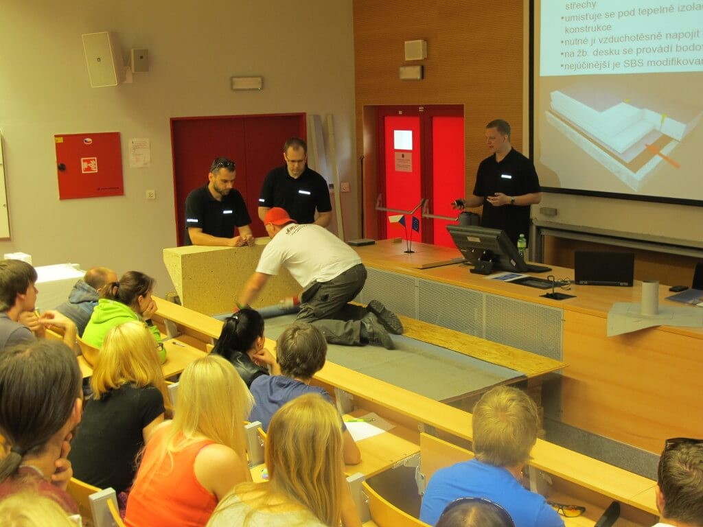 Na VŠB v Ostravě měli studenti dokonce možnost vidět ve výuce vedené Doc. Ing. Jaroslavem Solařem, Ph.D. realizaci výseku celé střešní skladby včetně detailů atiky z rukou zkušeného zhotovitele střech Pavla Rovňana. Teoretickým výkladem doplnili praktické ukázky naši technici Ing. Lukáš Klement, Ing. Michal Matoušek a Ing. Jiří Vilášek.