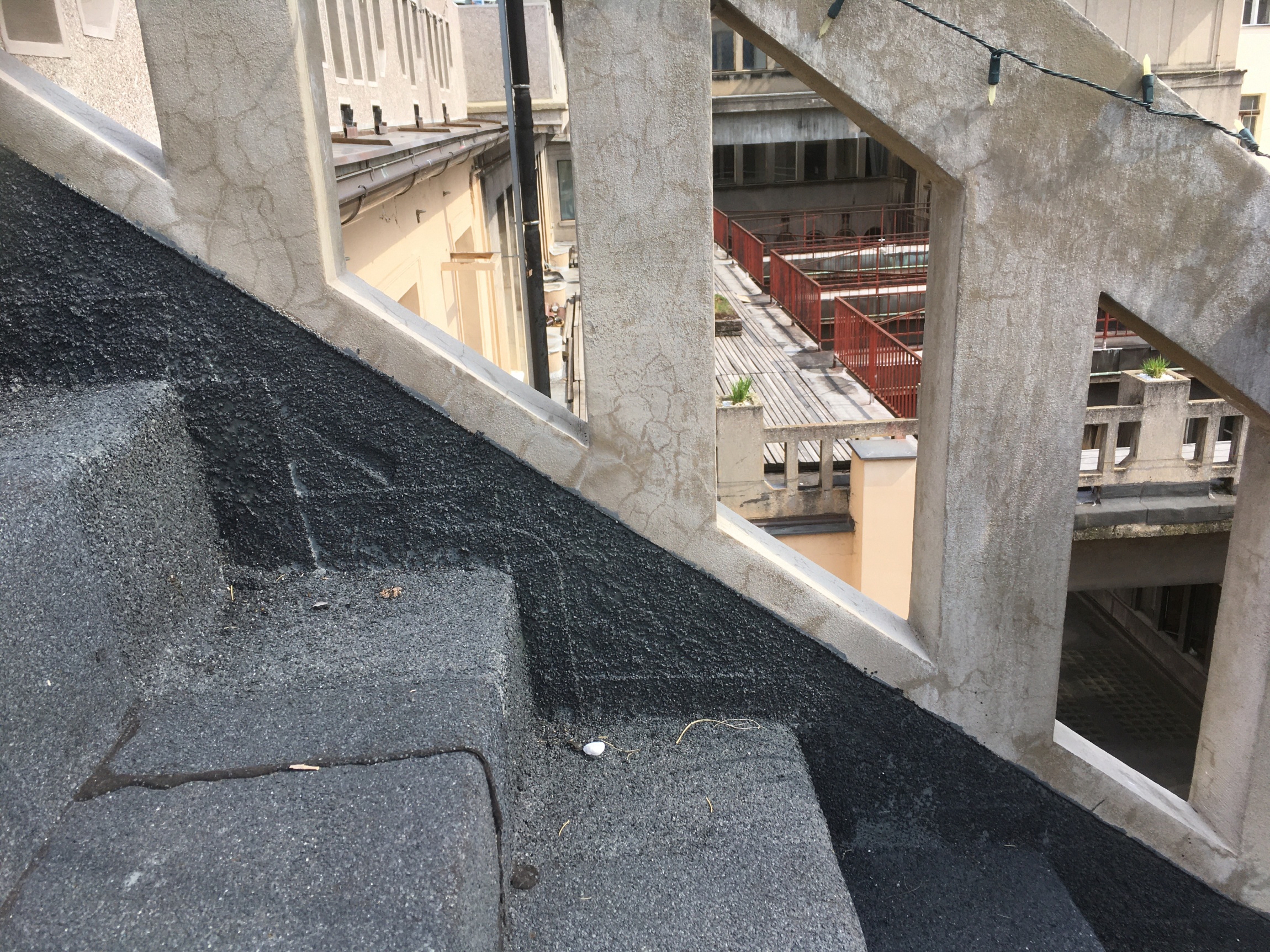 Následně bylo možné důkladněji vyrovnávat povrch střechy už bez většího rizika zatečení do souvrství teras a interiéru paláce. Vyrovnání se provádělo vrstvením přířezů asfaltových pásů, případně rozehřátým asfaltem. Cílem bylo vyloučit vznik kaluží na finálním povrchu hydroizolace teras.