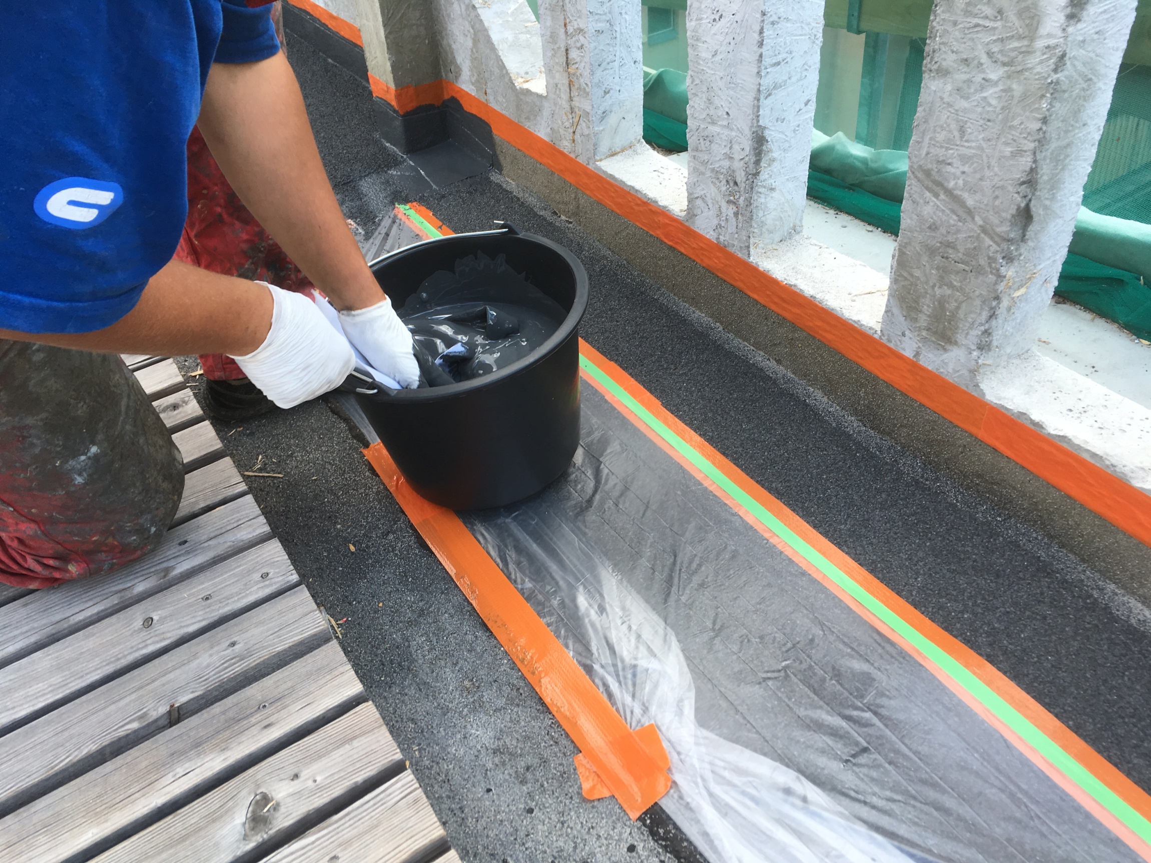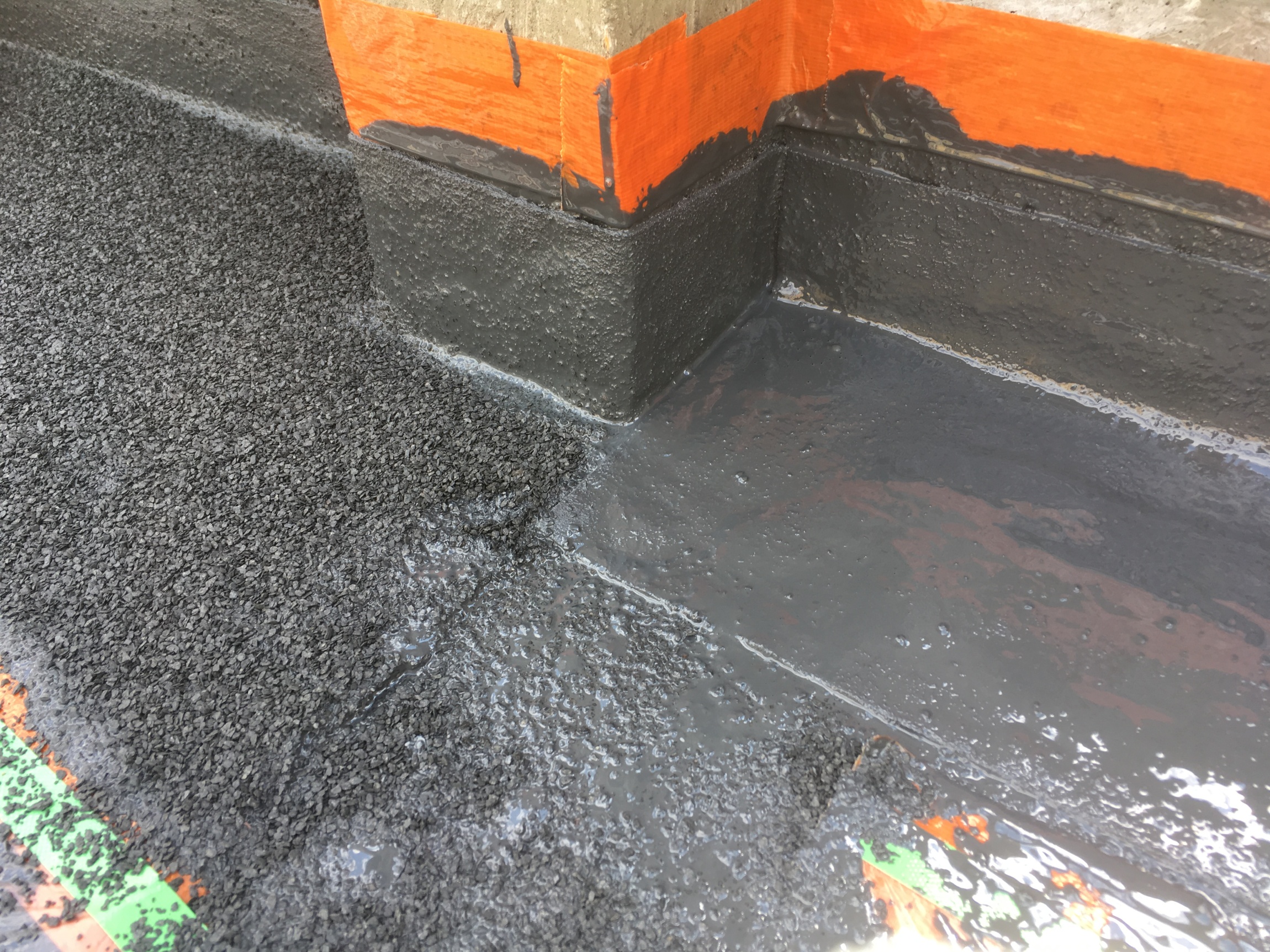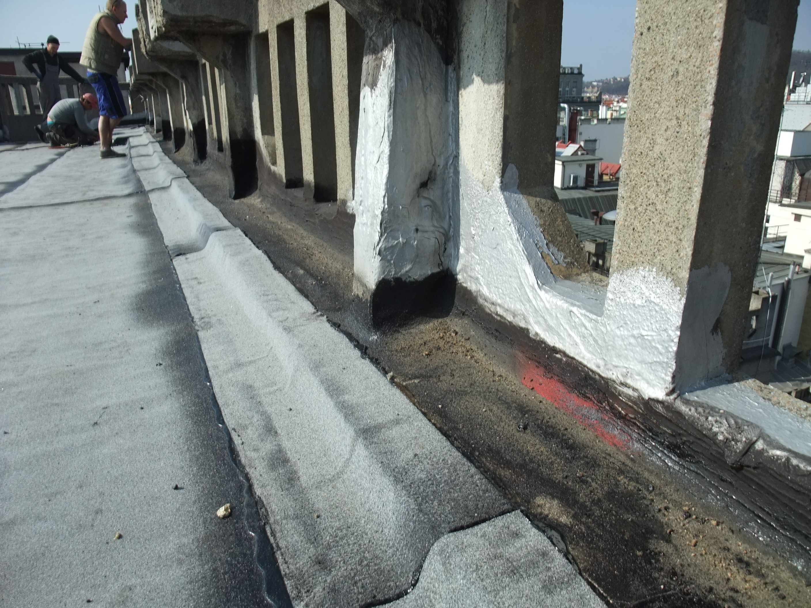 Obecně máme dobrou zkušenost se stěrkovými systémy na bázi polyuretanu. Vedle dobré životnosti je jejich velkou předností v porovnání s jinými osvědčenými materiálovými bázemi absence výrazného zápachu při provádění. Pro konkrétní aplikaci jsme nechali 2 dodavatele polyuretanových systémů provést vzorek přímo na terase. Pro realizaci byl nakonec zvolen systém Kemperol 2K PUR prováděný na vyspravený podklad betonového zábradlí, resp. povrch nových asfaltových pásů. Podklad je v obou případech ošetřený systémovou penetrací Kempertec, na svislém betonovém podkladu je do penetrace proveden vsyp křemičitým pískem pro dosažení kvalitnější přídržnosti stěrky.