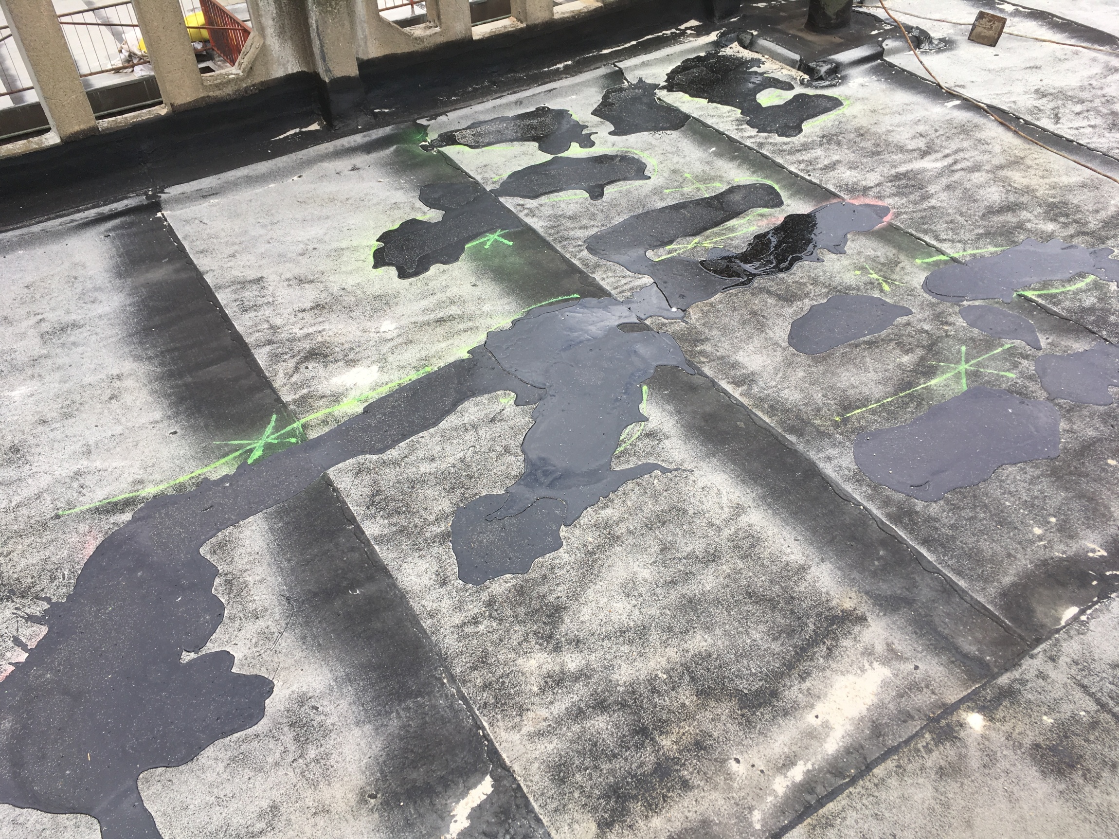 V sondách bylo zjištěno degradované a nesoudržné souvrství asfaltových pásů, mokrý a rozpadlý vyrovnávací beton a trochu překvapivě celkem pevná a soudržná původní asfaltová hydroizolace. Spádová vrstva škvárobetonu byla převážně vlhká, ne však mokrá. Zdrojem zatékání byly především netěsnosti v detailech po obvodu teras (napojení na betonová zábradlí a na stěny vyšších podlaží).