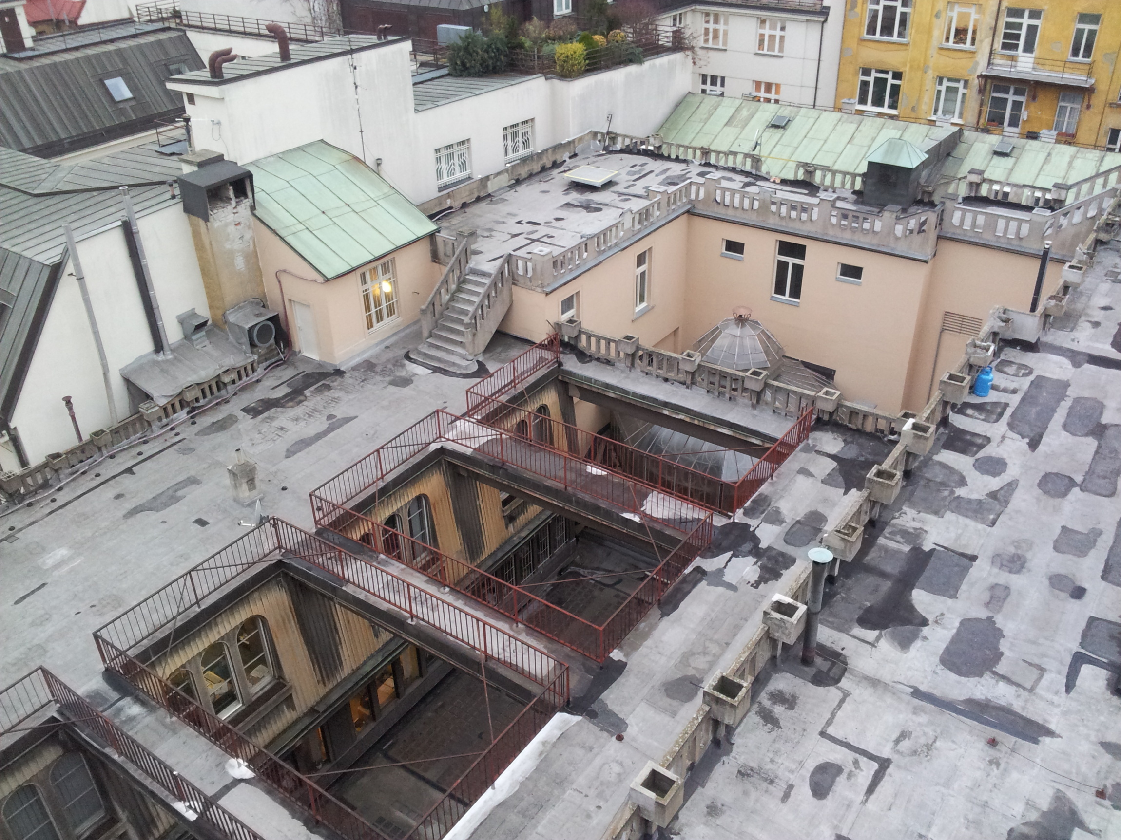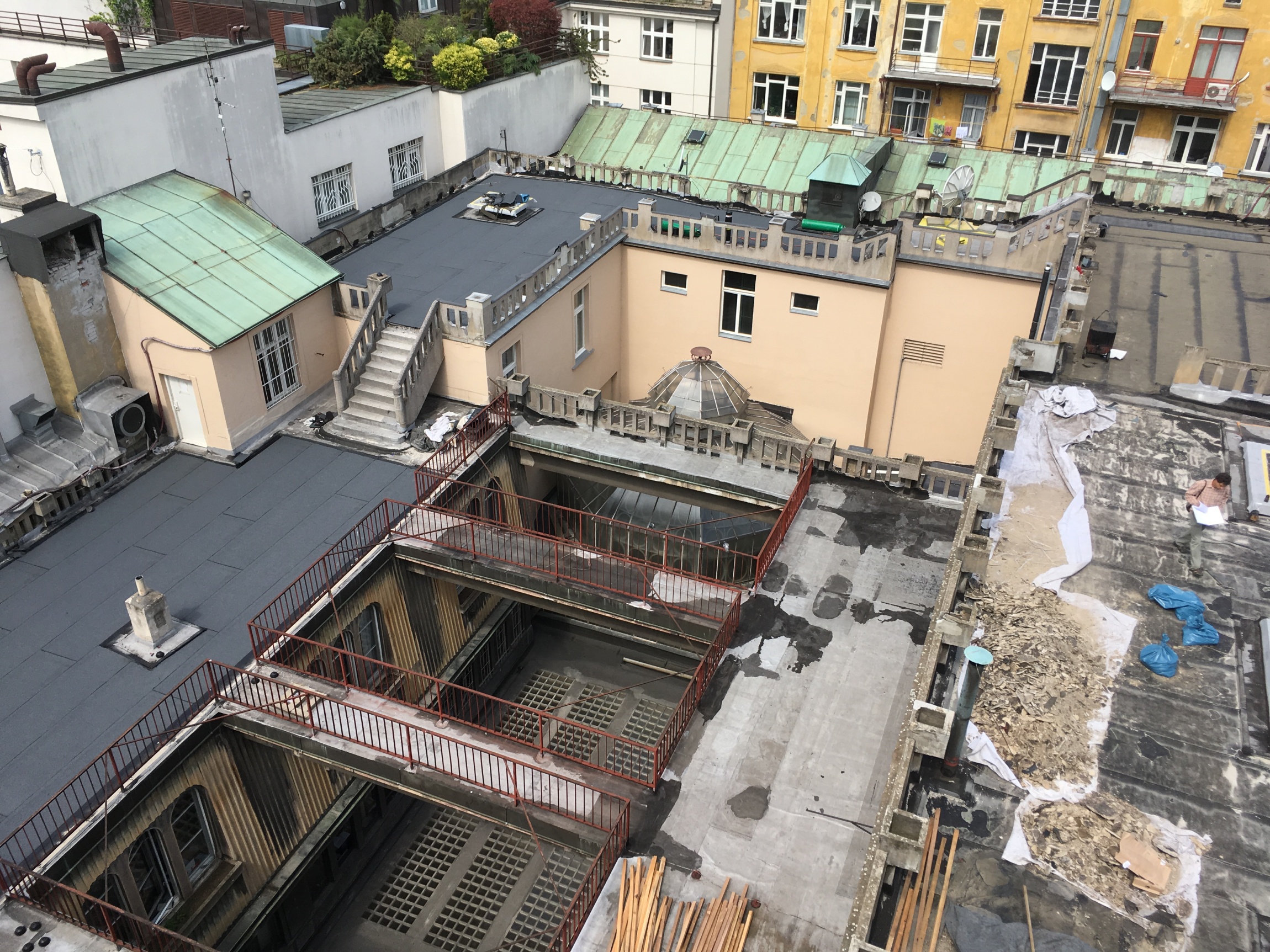 Sondami jsme zjistili, že souvrství teras tvořil hubený škvárobeton ve spádu, na jehož povrchu byla provedena vyztužená betonová mazanina s hlazeným povrchem. V místech, kde byla ve spádu už samotná nosná stropní konstrukce, škvárobeton nebyl. Následovala hydroizolace z asfaltu zpracovaného za horka s vloženou textilní výztuží. Střešní plochy jsou odvodněné skrz otvory v železobetonovém zábradlí do podokapních žlabů.