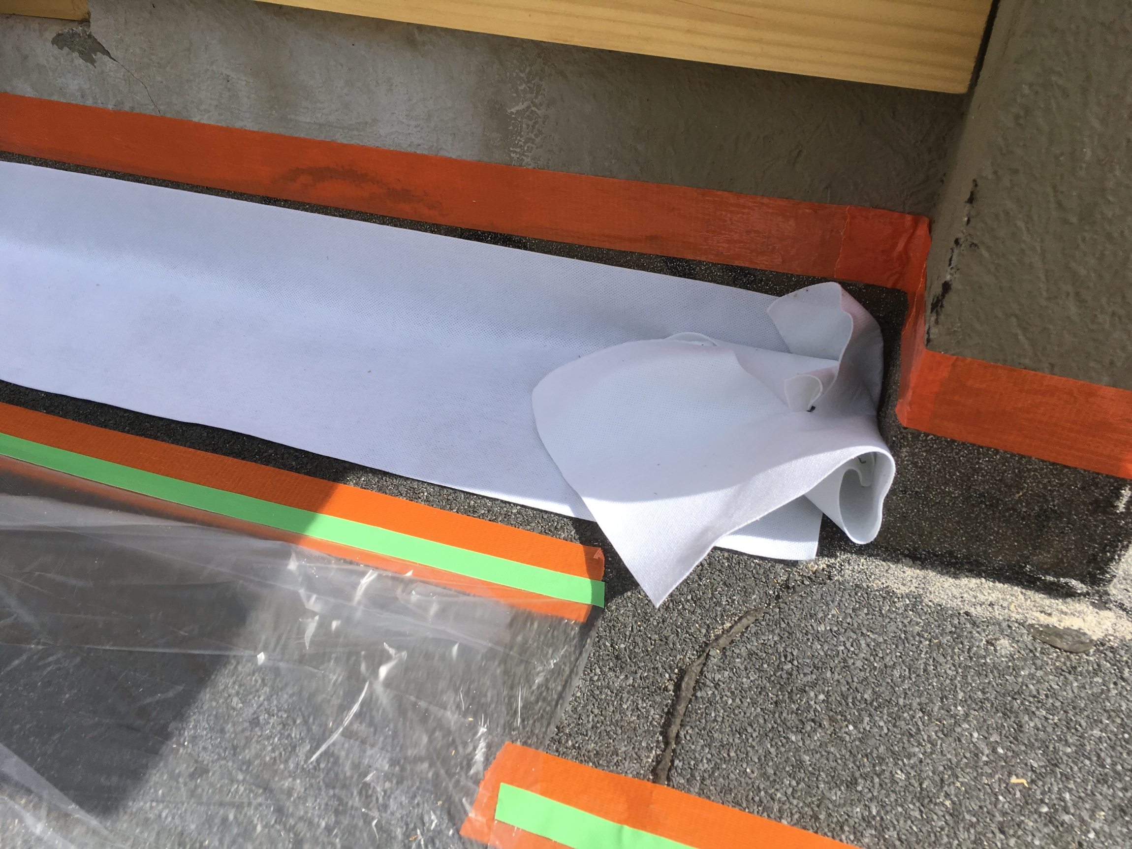 a) Lepení pomocných pásek a ochranné fólie na okraji detailu pro čisté ukončení stěrky, rozměření střihů výztužné vložky (vlies 165 g/m2). Jedná se o časově nejnáročnější krok.