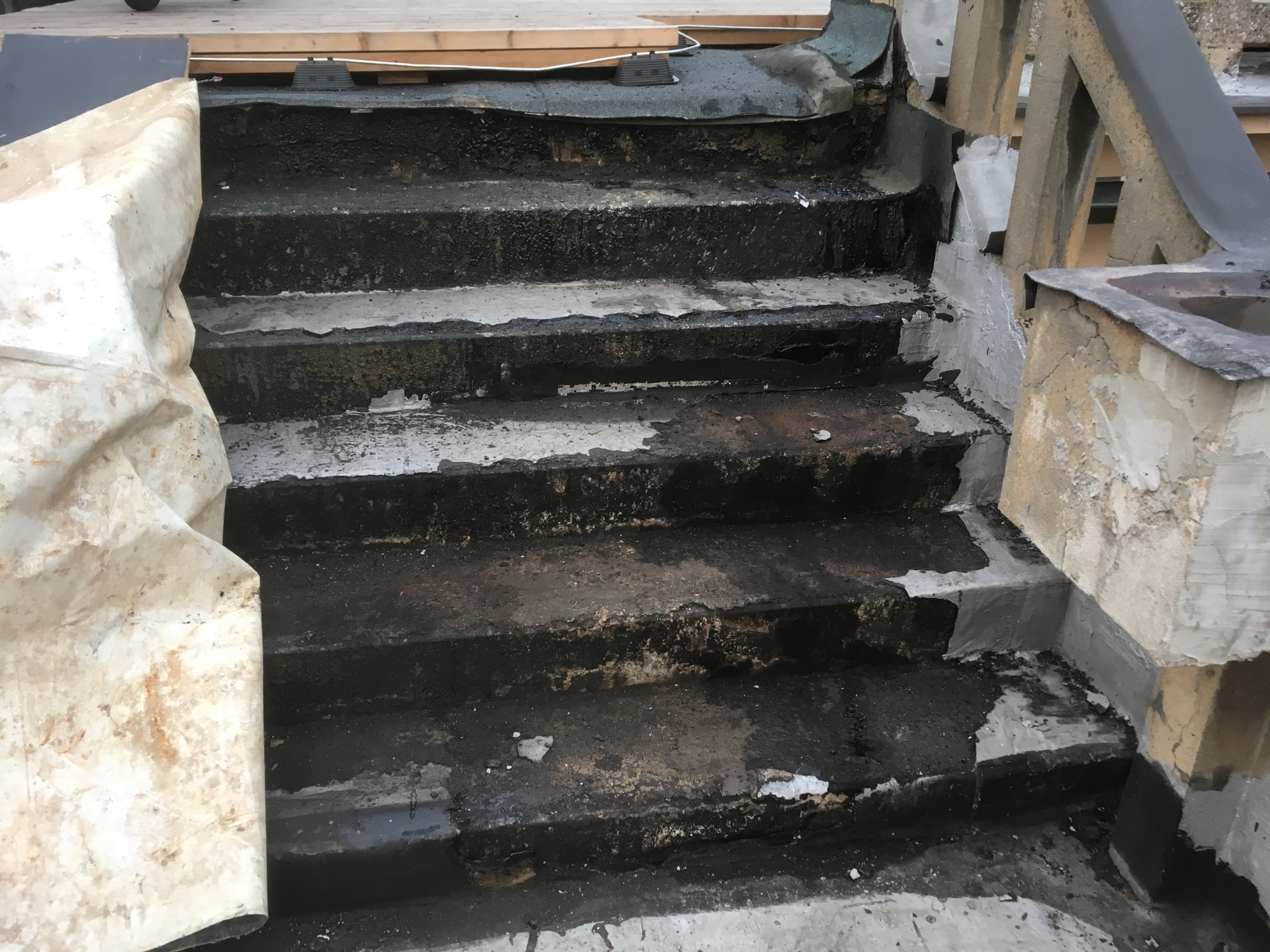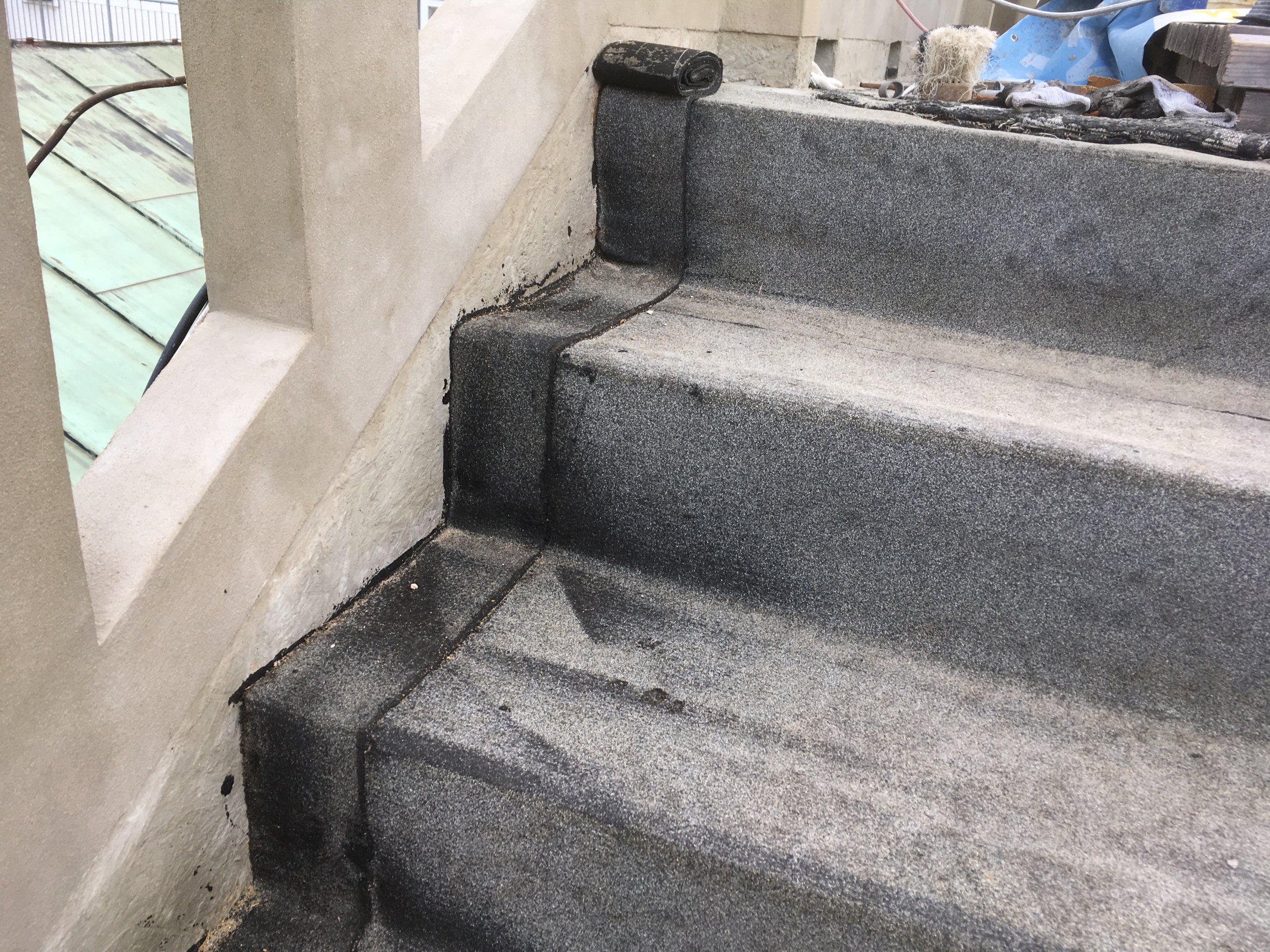 Novým povlakem bylo opatřeno i jedno ze spojovacích schodišť. V ploše schodiště bylo po odstranění nesoudržných vrstev asfaltových pásů po vyspravení obnaženého betonového podkladu provedeno stejné souvrství asfaltových pásů, jako v ploše teras. Na okrajích je zopakováno výše uvedené ukončení hydroizolační stěrkou. Po dokončení hydroizolace bude schodiště obloženo dřevem stejně jako plocha teras.