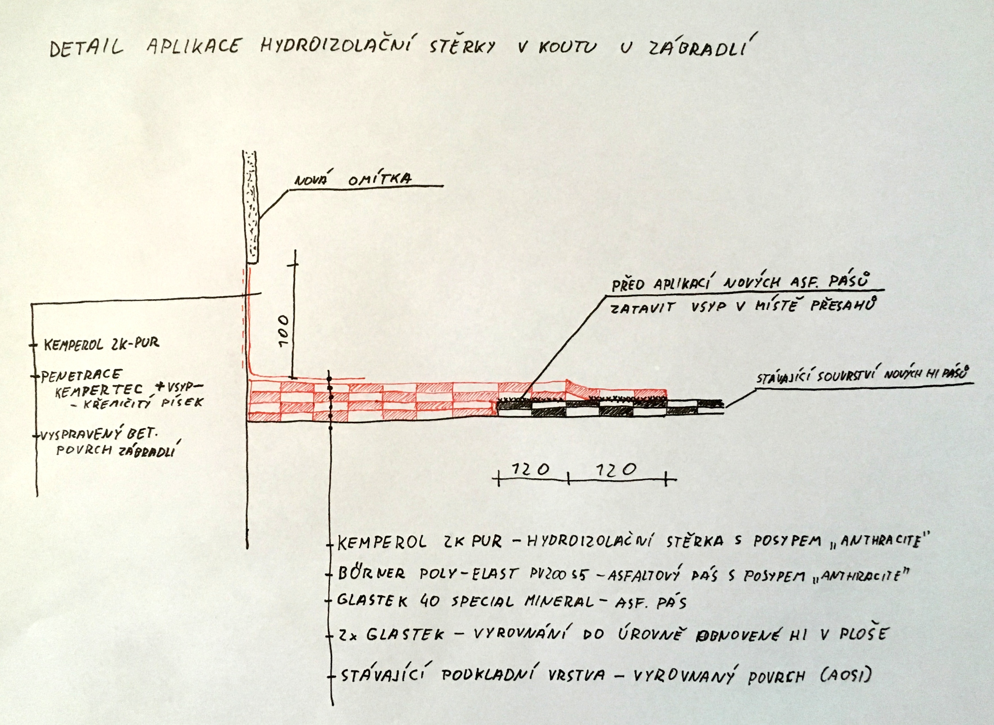 Detail okraje teras se zábradlím je pro spolehlivé řešení nové hydroizolace teras zásadní především kvůli své několikasetmetrové výměře. Památkáři striktně vyloučili přidání nových klempířských prvků, které obvykle stabilizují asfaltový povlak proti odchlípnutí a kryjí napojení na svislou konstrukci. Hledali jsme proto spolehlivé alternativní řešení ukončení hydroizolačního povlaku na opraveném zábradlí s využitím stěrkového systému. Ten je na rozdíl od asfaltových pásů možné při dodržení předepsaných technologických zásad spolehlivě celoplošně spojit s podkladem a tím lze docílit jeho přídržnosti na stability na svislém podkladu i bez zmíněných klempířských prvků. Princip provedení je zobrazen na následujícím schématu.