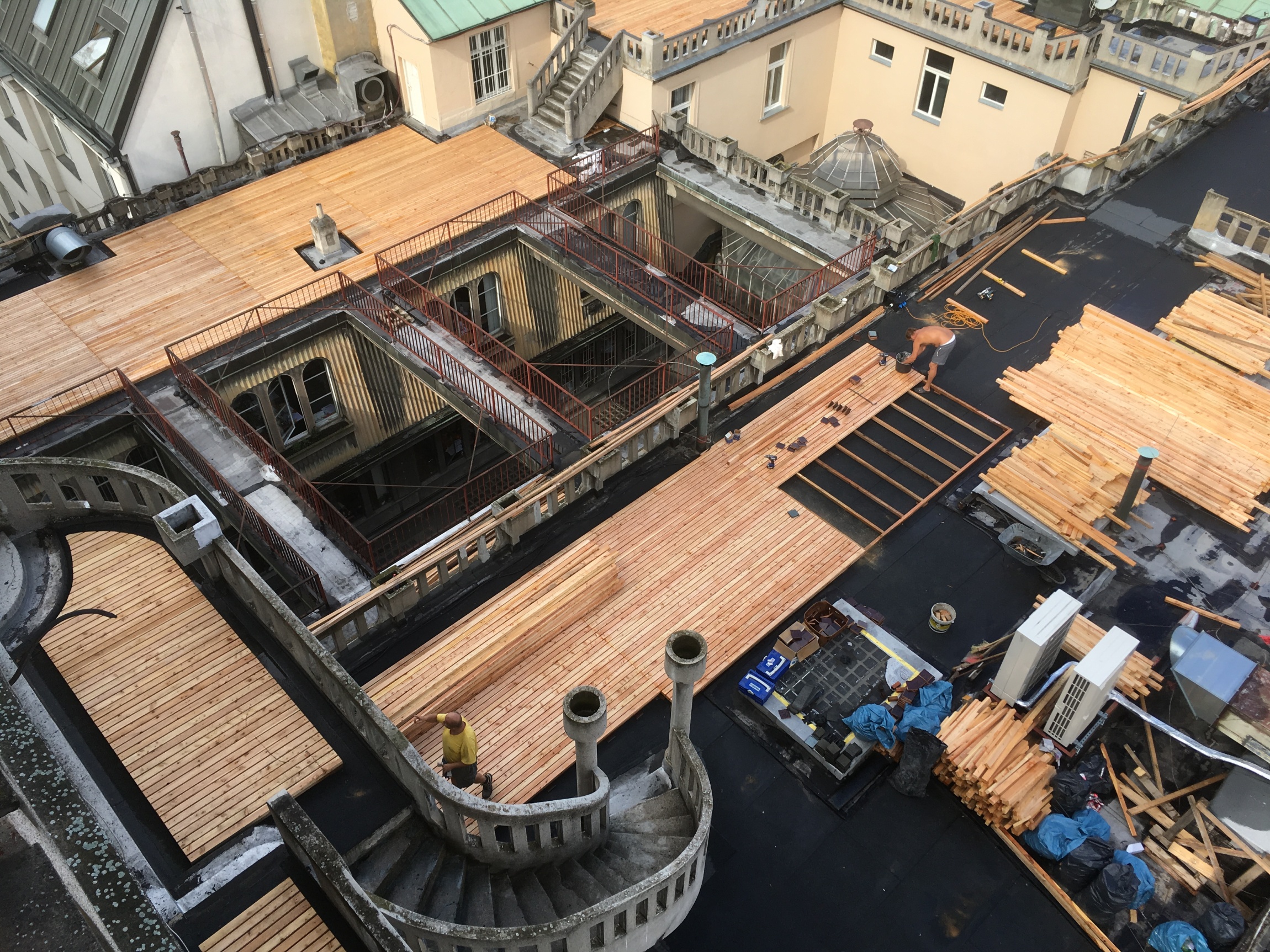 Na novou hydroizolaci byl na podložky uložen lehký demontovatelný dřevěný rošt s palubou ze sibiřského modřínu. Paluba tedy nakonec chrání novou izolaci proti poškození jak při kulturních a společenských aktivitách na terasách, tak při hrubších pracovních činnostech prováděných v rámci postupného restaurování několika stovek metrů železobetonového zábradlí. Právě z důvodu postupného restaurování zábradlí byla hydroizolace i dřevěná paluba teras etapově ukončena cca 30 - 50 cm od zábradlí a dokončování návaznosti hydroizolace na zábradlí probíhá spolu s restaurováním zábradlí.