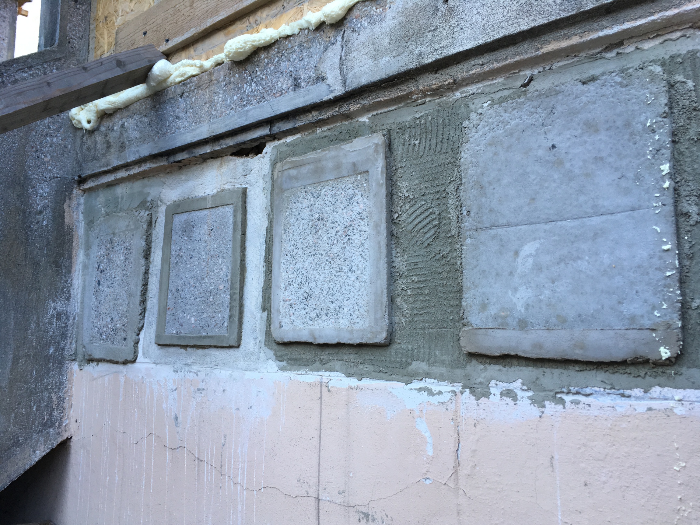 Teracová omítka se po důkladném vyzrání v kontrolovaném prostředí opracovává pemrlováním, v rozích prolamovaného zábradlí zůstává dekorativní šanýr. Jedná se o technologický lem, při pemrlování by došlo k uražení rohu.