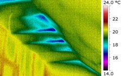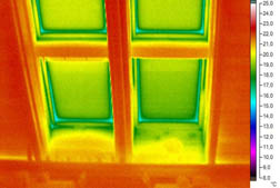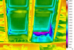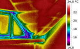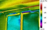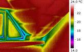 Obr. 09 Vikýř, snížené povrchové teploty patrné již při přirozeném tlakovém rozdílu, při podtlaku se nevzduchotěsná místa více propsala