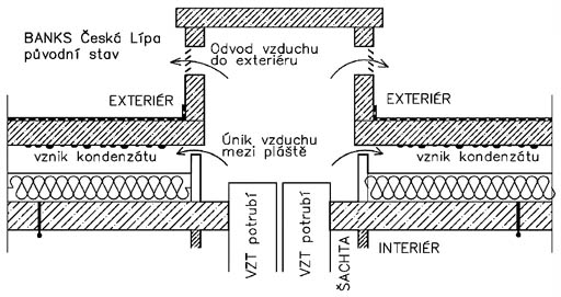 Princip problému je znázorněn na obr. 01. Vzduch z interiéru stoupá ventilačním potrubím do tlumicí komory. Ventilační potrubí je v komoře ukončeno. Vzduch z interiéru by měl být odveden do exteriéru. Protože je však komora vadná, je vnitřní teplý vzduch nasáván štěrbinou ve stěnách komory do větrané vzduchové vrstvy. Ve vzduchové vrstvě a u chladných povrchů stoupne relativní vlhkost vzduchu a dochází ke kondenzaci – zejména na spodním povrchu horního pláště střechy. Kondenzát namrzá na chladném povrchu a po oteplení taje, stéká na spodní plášť a prosakuje spárami v panelech do interiéru. Odstranění problému spočívá v dodatečném oddělení prostoru tlumicí komory od větrané vzduchové vrstvy dvouplášťové střechy. To obvykle realizujeme položením desky tepelné izolace z EPS s nakašírovaným asfaltovým pásem (POLYDEK). Asfaltový pás se vytahuje na stěny komory a opracují se jím veškeré prostupy (ventilační a kanalizační potrubí, příp. kabely), obr. 02, 04 a 07.