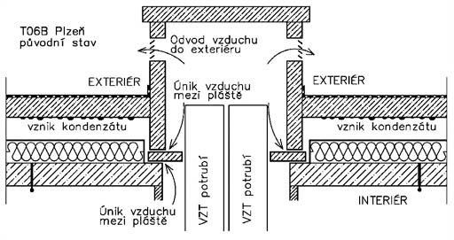 Na bytovém domě T06B v Plzni vše nasvědčovalo stejnému problému. Majitel objektu předpokládal, že se jedná o zatékání netěsnou krytinou. Nechal proto provést kompletní rekonstrukci hydroizolace střechy. Zatékání však neustalo. Atelier stavebních izolací, na který se majitel následně obrátil, odhalil vadu tlumicích komor a navrhl standardní způsob odstranění, tzn. oddělení prostoru komory od vzduchové vrstvy /obr. 04/. Ani toto opatření však nevedlo k úplnému odstranění vlhkostních problémů.