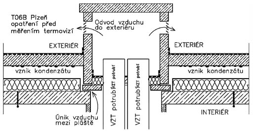K další identifikaci bylo využito termovizní měření. To bylo provedeno jednak v interiérech bytů v posledním nadzemním podlaží a jednak na střeše. Umožnilo zjistit bez nutnosti odkrývání horního pláště další proudění teplého vzduchu z interiéru. Princip je na /obr. 04/.