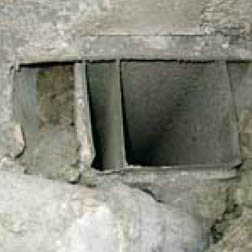 Při bližším prozkoumání šachet byl zjištěn další otvor /obr. 3, 4, 13 a 14/. Jedná se o štěrbinu mezi stropním panelem a spodní částí šachty způsobenou chybějícím podbetonováním. Svou orientací otvory odpovídají termograficky zjištěným průnikům teplého vzduchu z interiéru do střechy.