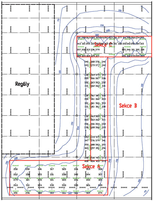 sekce A: 3 řady po 8 ks svítidel umístěných ve výšce 4,0 m nad podlahou