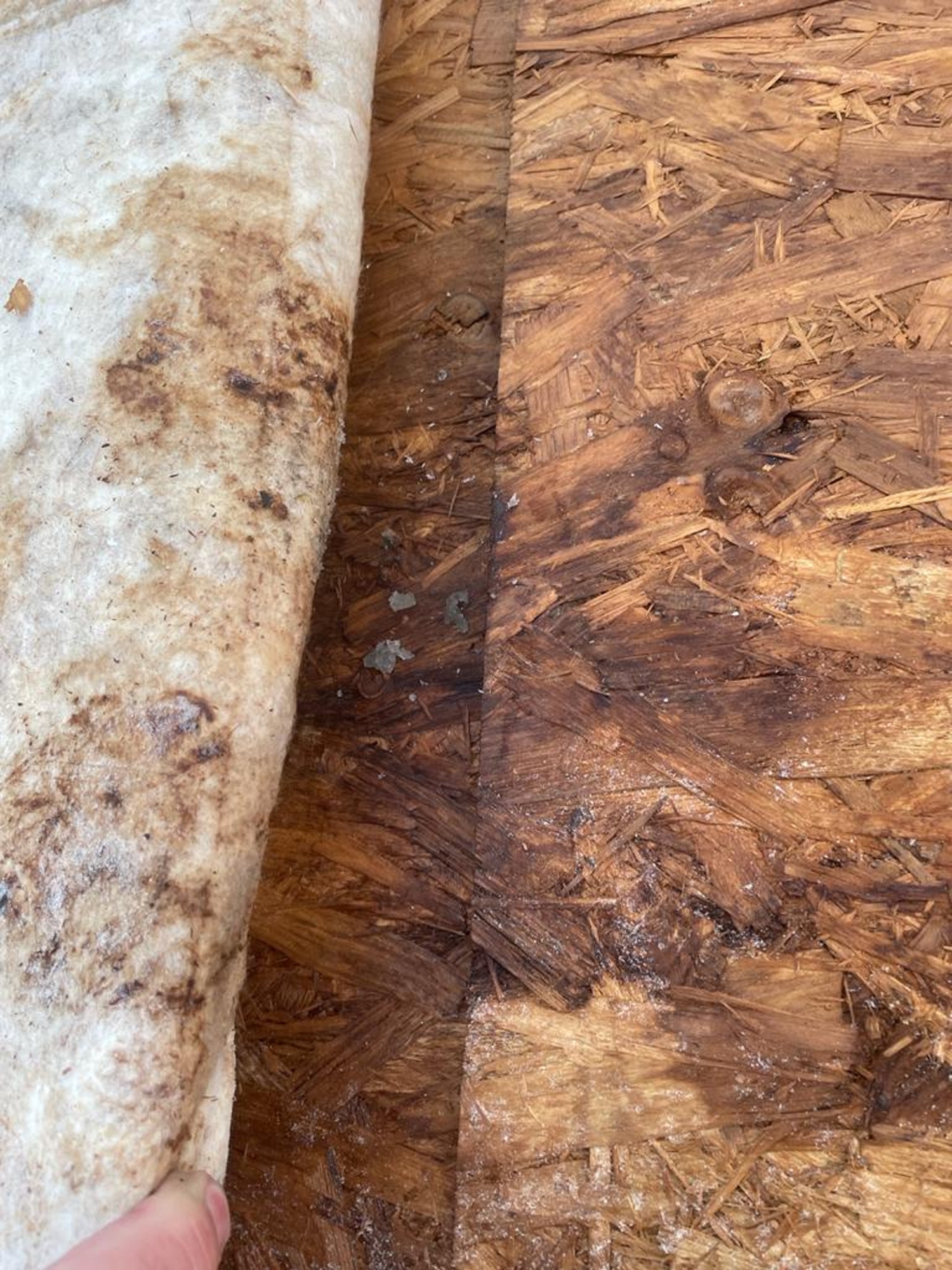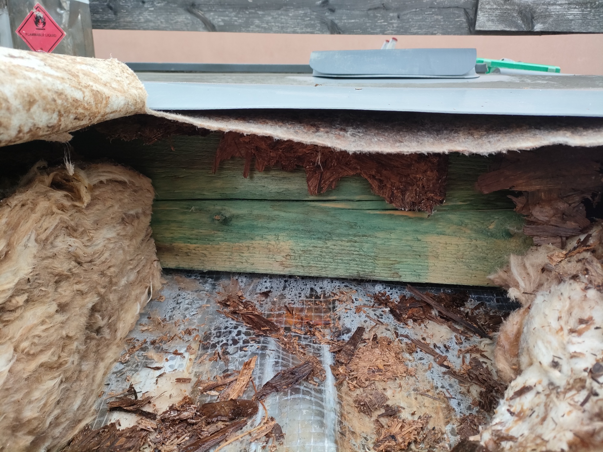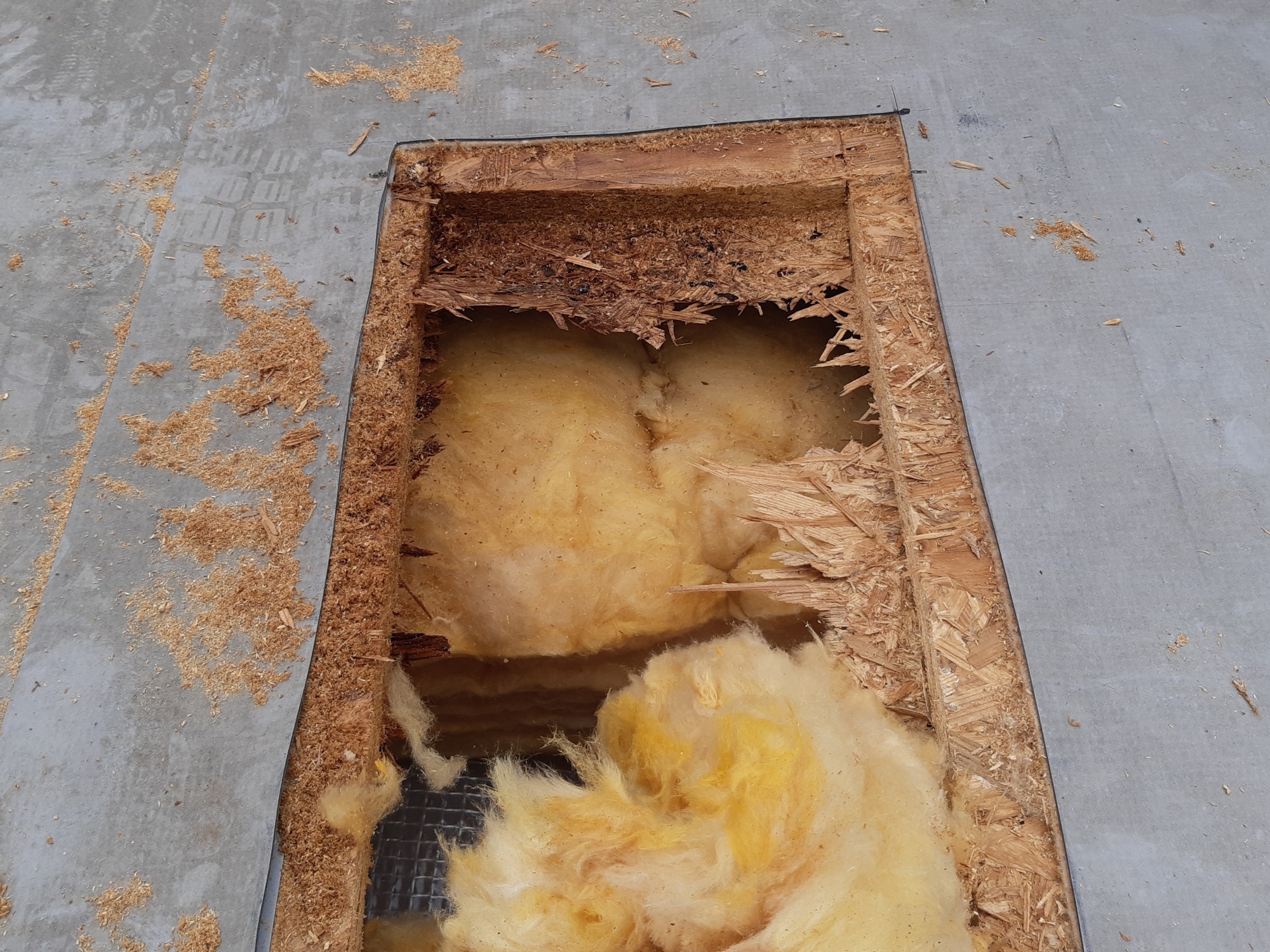 V tomto případě se na havarijní stav střechy přišlo v souvislosti se záměrem instalovat na střechu fotovoltaické panely. Indikátorem byl nadměrně se prohýbající záklop z OSB desek, tvořící podklad pro hydroizolaci. Hned v první sondě se ukázalo, že je shnilý (Obr. 1).