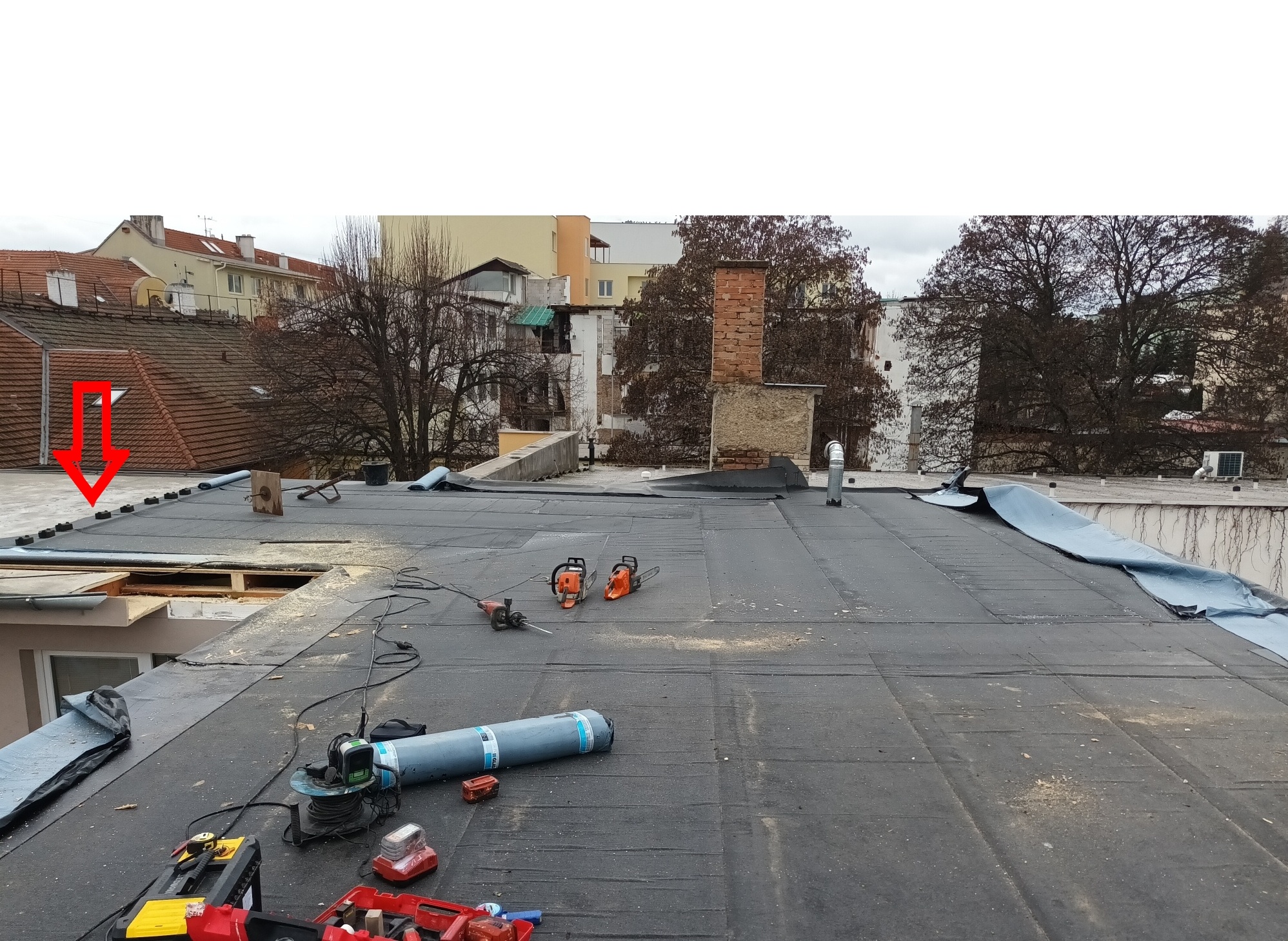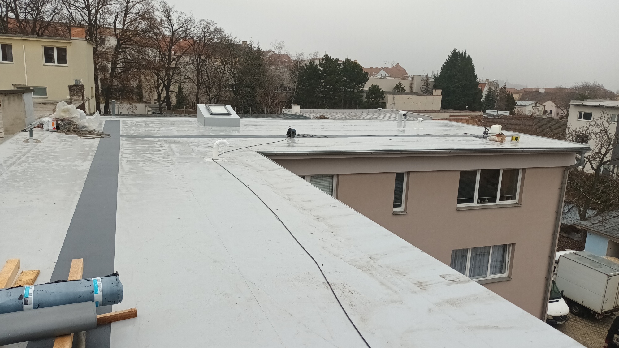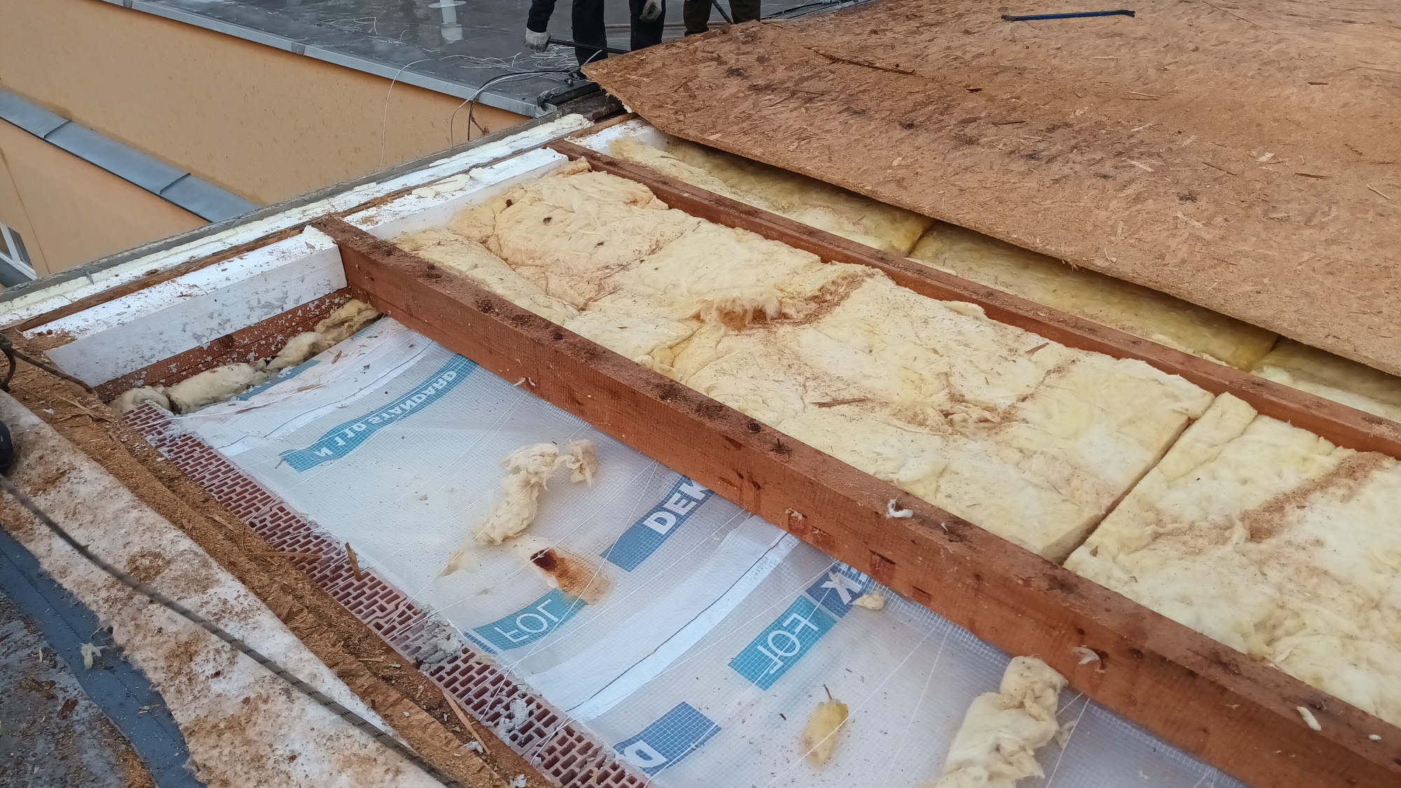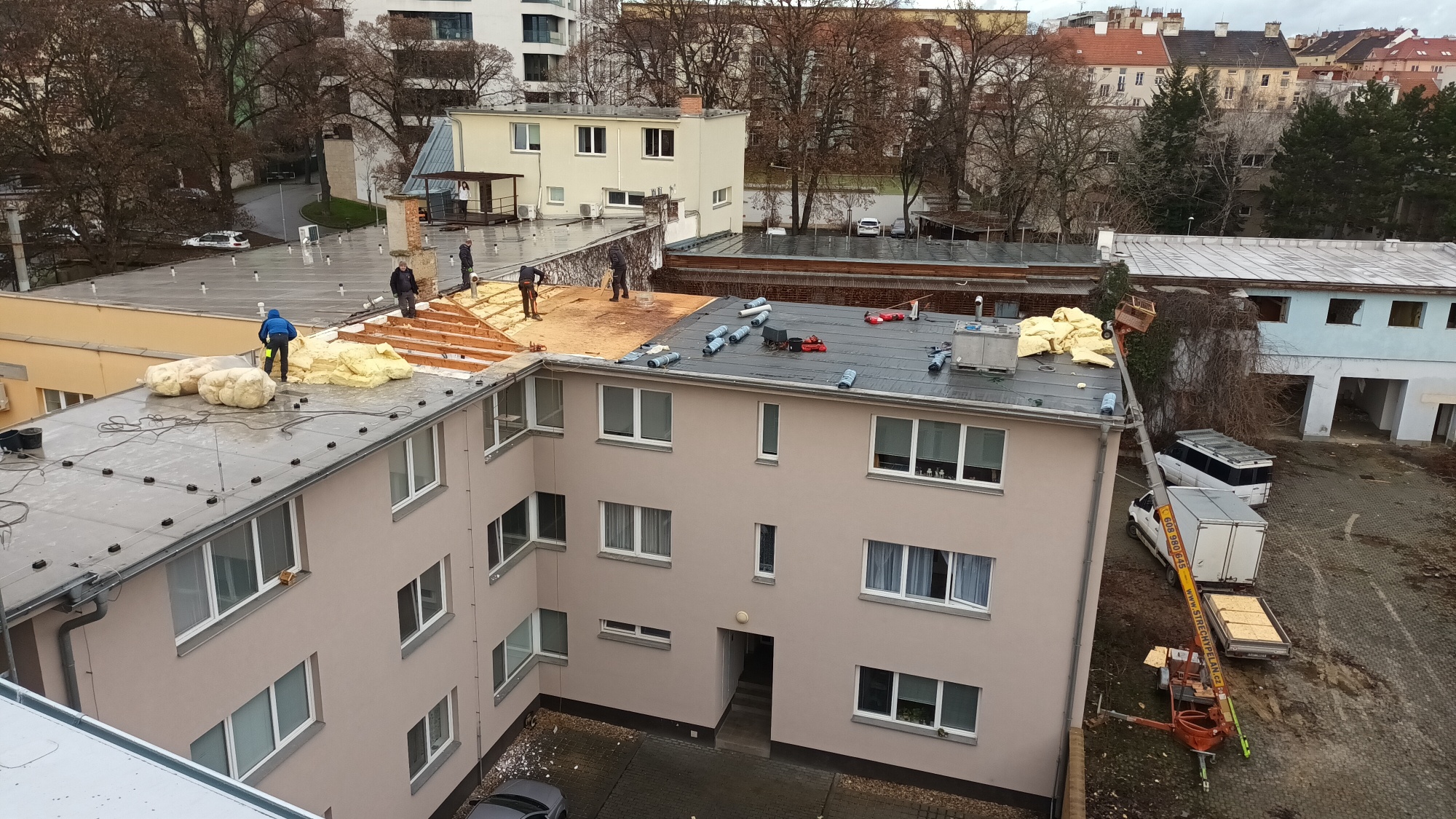 Pro opravu střechy byla zvolena nadkrokevní skladba odpovídající Dekroof 07 (ST.1007) s parozábranou, tepelnou izolací a hydroizolací na novém záklopu připevněném k ošetřeným původním krokvím. Toto řešení při rekonstrukci umožňuje dostatečně spolehlivě hydroizolačně zabezpečit etapovou spáru mezi starou a novou skladbou (původní hydroizolace se dočasně propojí s novou parozábranou z asfaltových pásů). Nová parozábrana je sice ze samolepicího asfaltového pásu Glastek 30 Sticker Plus, ale při realizaci rekonstrukce v lednu bylo třeba pás nahřívat horkým vzduchem, aby spoje byly kvalitní.