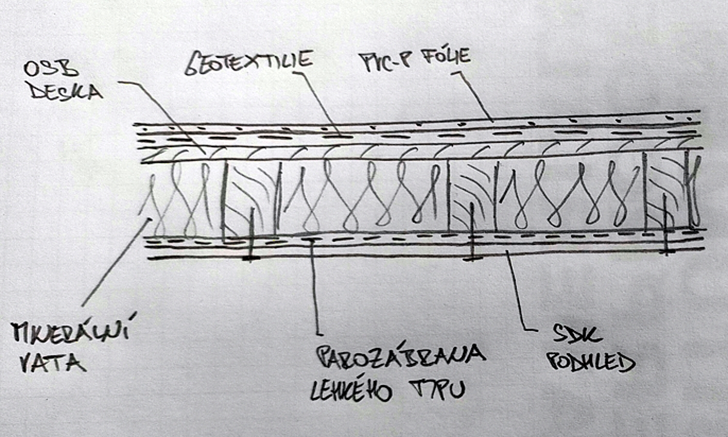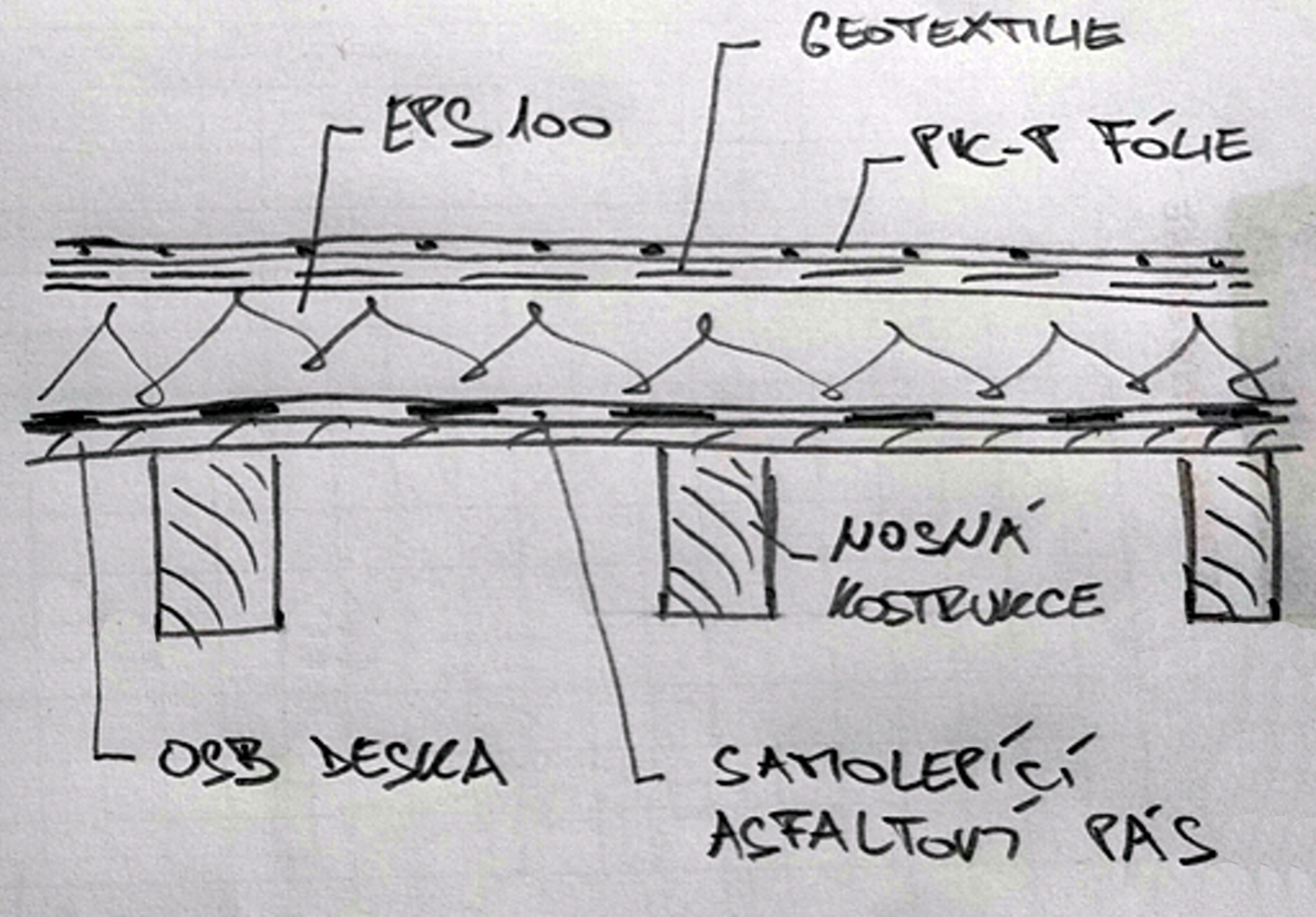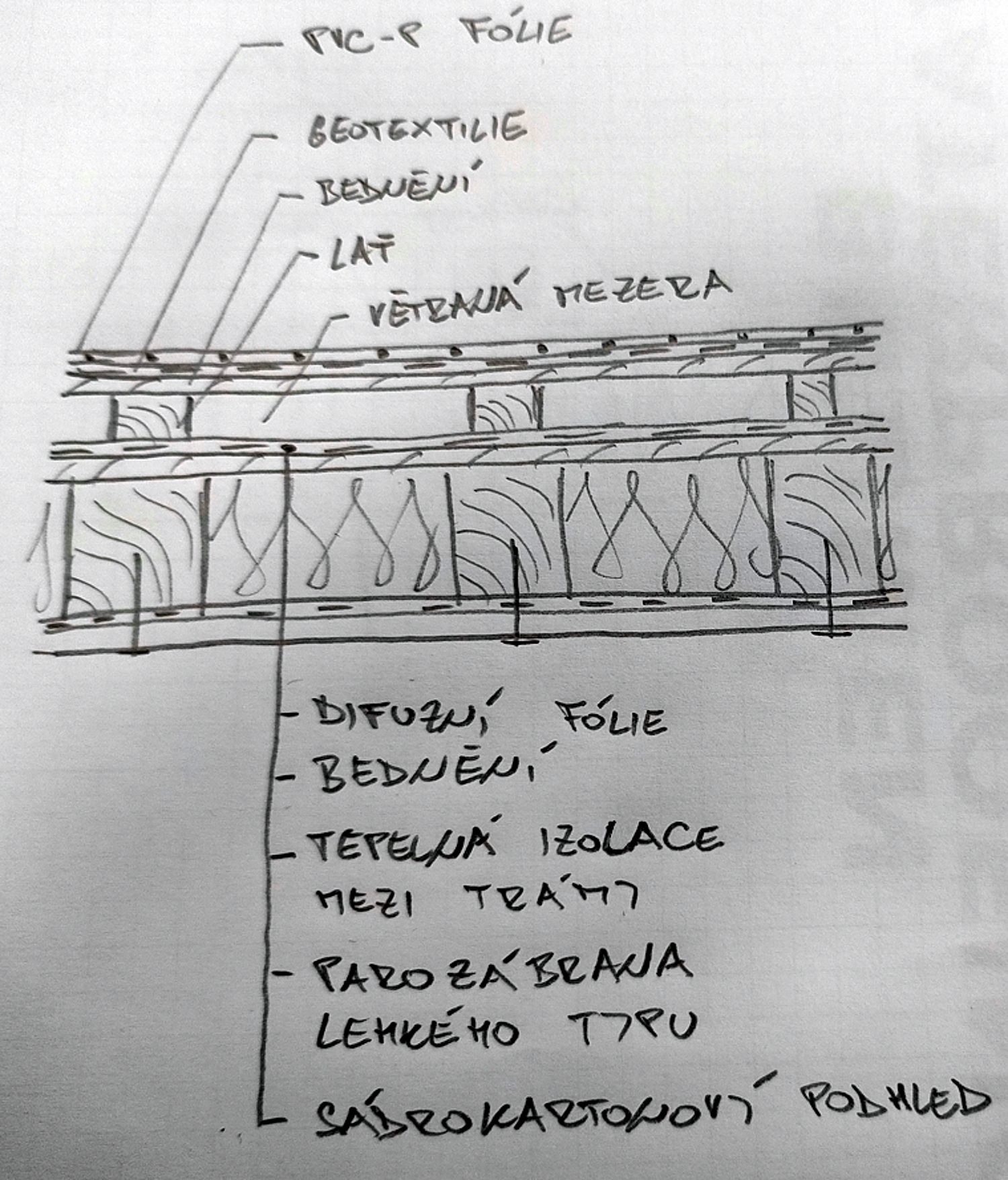 Nefunkční skladba ploché střechy byla provedena se zateplením mezi krokvemi, bez větrání pod záklopem a s povlakovou hydroizolací. Parozábrana z lehké fólie byla provedena zespodu spolu s podhledem.