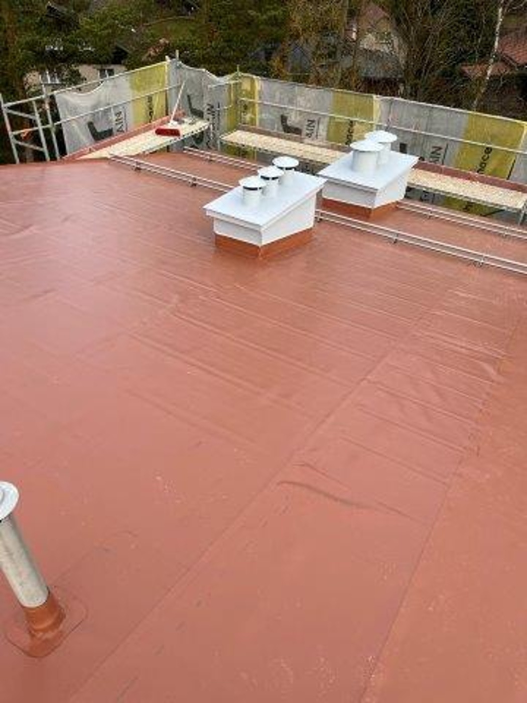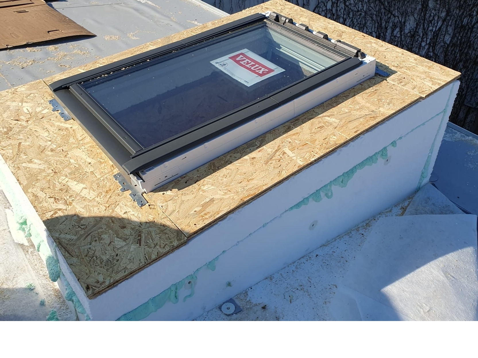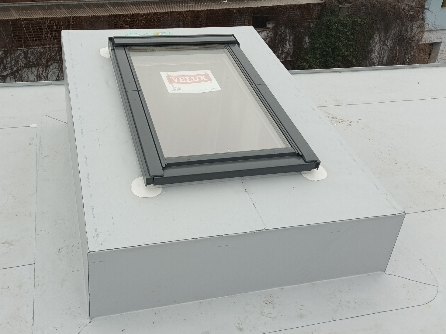 Nefunkční skladba ploché střechy byla provedena se zateplením mezi krokvemi, bez větrání pod záklopem a s povlakovou hydroizolací. Parozábrana z lehké fólie byla provedena zespodu spolu s podhledem.