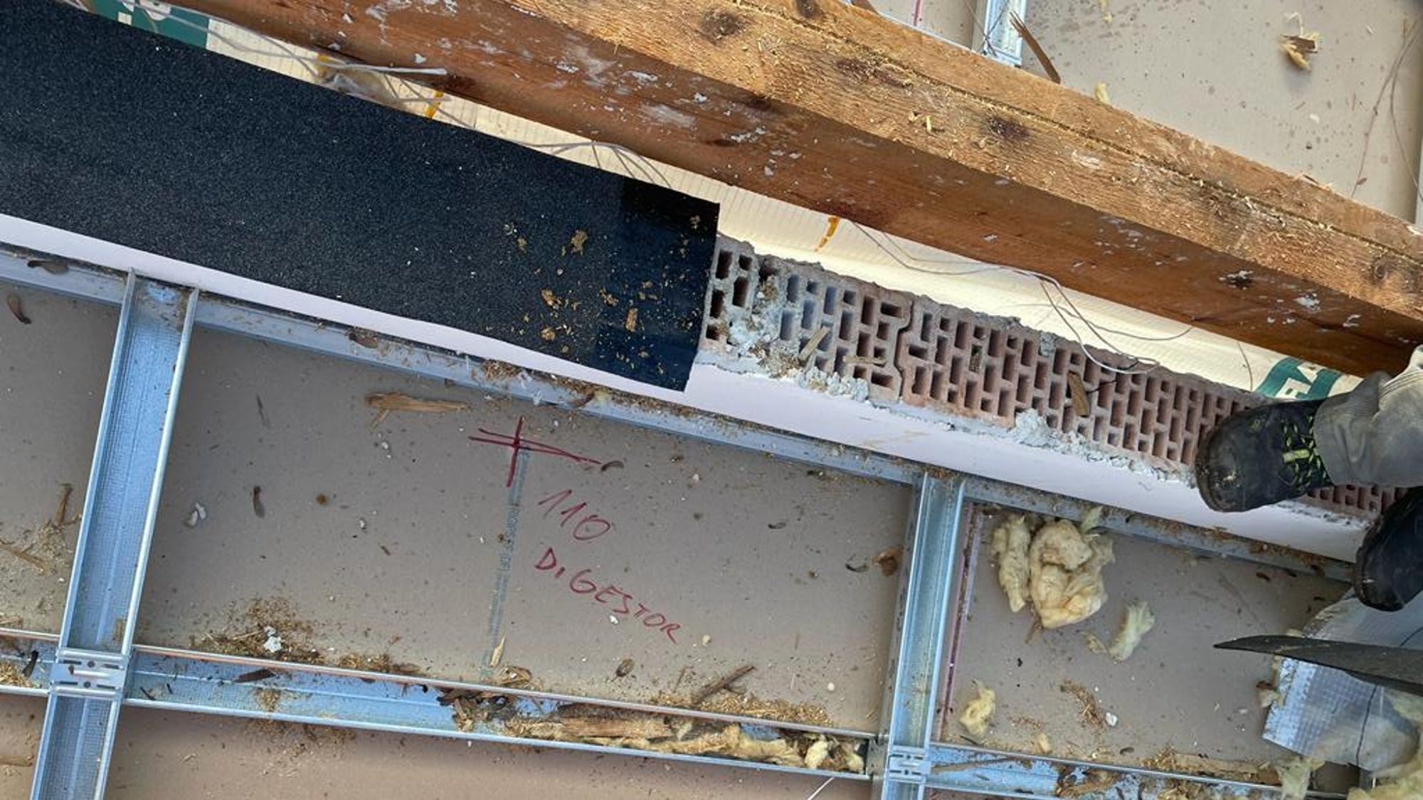 Z výše uvedených fotografií je patrné, že kromě nevhodně řešených příček a stěn z dutinových cihel bez uzavření koruny věncem jsou zdrojem vlhkosti pronikajícící do střešní skladby netěsnosti v parozábraně. Nejrizikovějšími místy ohrožujícími parotěsnost a vzduchotěsnost fóliové parozábrany jsou prostupy instalací, které provedli nejspíš pracovníci jiných řemesel až po sádrokratonářích. Bohužel se s neúctou (nebo snad ignorací z neznalosti souvislostí) jednoho řemesla k práci předcházejícího řemesla na stavbách setkáváme velmi často. A technický dozor buď není pro stavbu sjednán nebo nepůsobí na stavbě v dostatečném rozsahu.