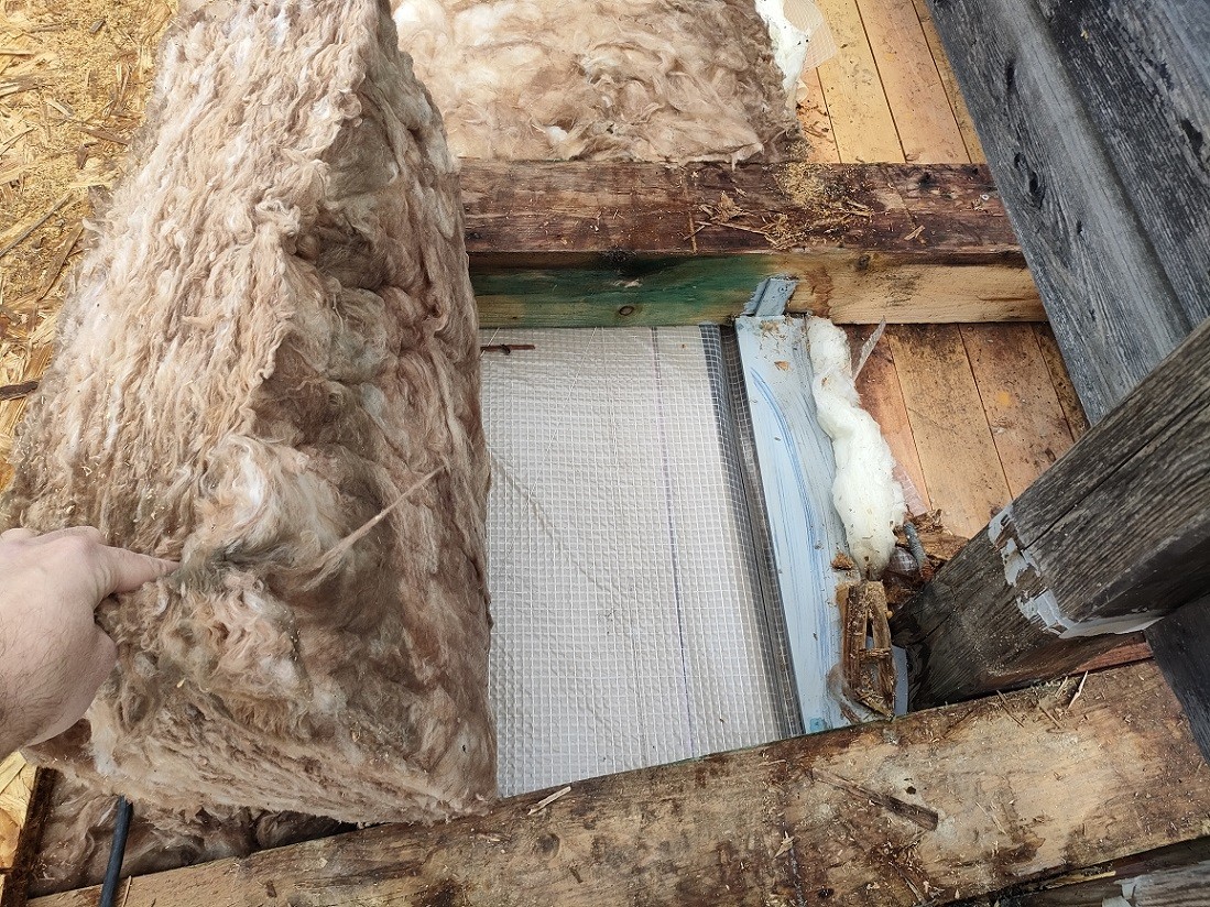 tepelná izolace z minerální vaty vložená mezi dřevěné trámy