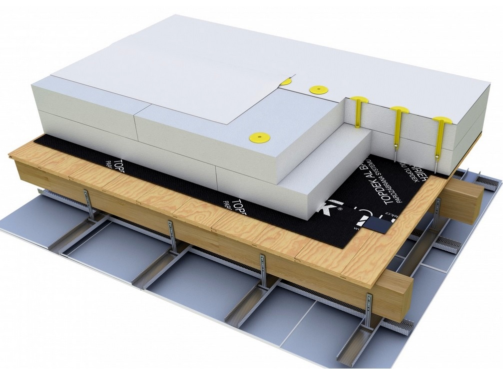 Na základě dlouhodobých zkušeností za ideální řešení dřevěných střech s povlakovou hydroizolací považujeme jednoplášťovou skladbu na nosné konstrukci z dřevěných hranolů s bedněním. Zjednodušeně lze říci, že se tepelná izolace přesune nad bednění, na kterém je parozábrana ze samolepicího asfaltového pásu (Schéma C).