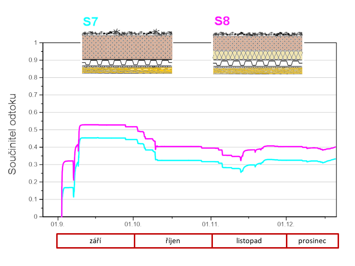 Výsledky z měření také potvrzují předpoklad výrazného pozitivního přínosu v letních obdobích s náhlými krátkodobými přívalovými dešti, kdy je schopna vyschlá skladba střechy krátkodobě naakumulovat velké množství vody, které se následně odpaří nebo s významným zpožděním odteče ze střechy. Právě toto zpoždění odtoku vody umožní plynulejší odvedení vody do kanalizace nebo vsakovacích zařízení.