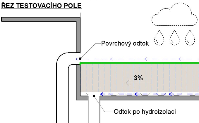 Abychom lépe pochopili skutečné chování vegetačních střech, provádíme v experimentálním centru DERIC v Brně dlouhodobé monitorování retenčních (odtokových) parametrů různých typů vegetačních střech v reálných podmínkách. DERIC podrobněji představíme ve čtvrtém díle tohoto seriálu. Měříme odděleně množství vody, které odtéká po povrchu skladby a po hydroizolaci, viz Obr. 6. Díky tomu umíme lépe odvodit množství vody, které vegetační souvrství zachytí, zadrží anebo odpaří.