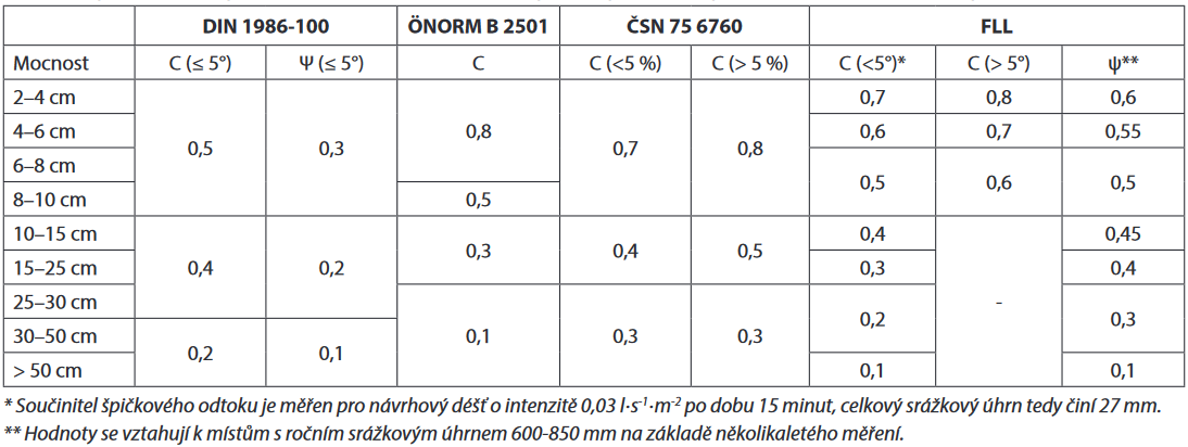 V publikaci [13] je uvedena souhrnná tabulka, viz Obr. 5, ve které jsou porovnány hodnoty součinitele odtoku z vegetační střechy podle související německé, rakouské a české normy [7] a podle směrnice pro zelené střechy [11]. Tabulka rozlišuje mezi špičkovými a průměrnými (ročními) hodnotami a dále dělí hodnoty podle sklonu střechy a mocnosti vegetačního souvrství.