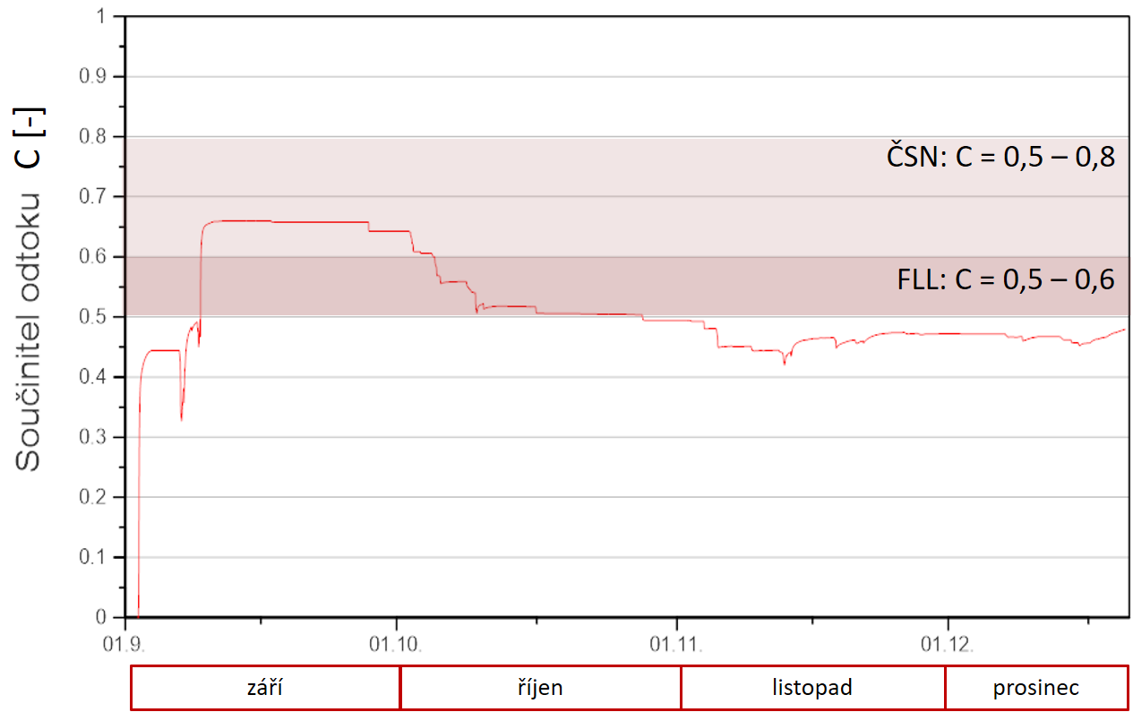 V dlouhodobějším horizontu se průměrná hodnota C snižuje díky mírnými krátkodobými dešťům, při kterých se voda vsákne do vegetačního souvrství a ze střechy odtéká pouze malá část vody. Tato vlastnost je patrná z Obr. 11, kde je vidět průběh z měření součinitele C během období září až prosinec roku 2019. Proto i metodika FLL uvádí orientační hodnoty pro stanovení ročního (dlouhodobého) součinitele odtoku C (dle [11] se značí a). Na Obr. 12 je patrné, že pro sledovanou skladbu šikmé vegetační střechy mají změřené hodnoty dobrou shodu s hodnotami ročního součinitele odtoku a dle FLL [11].