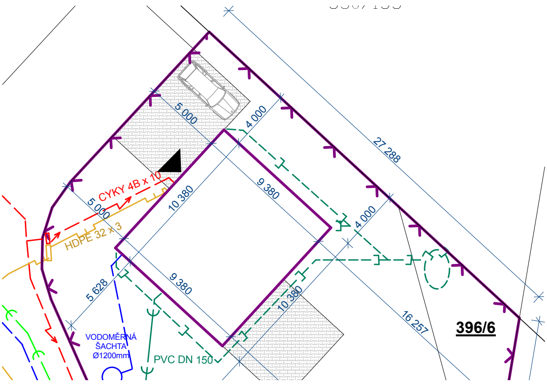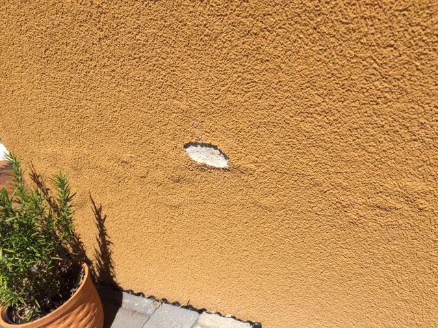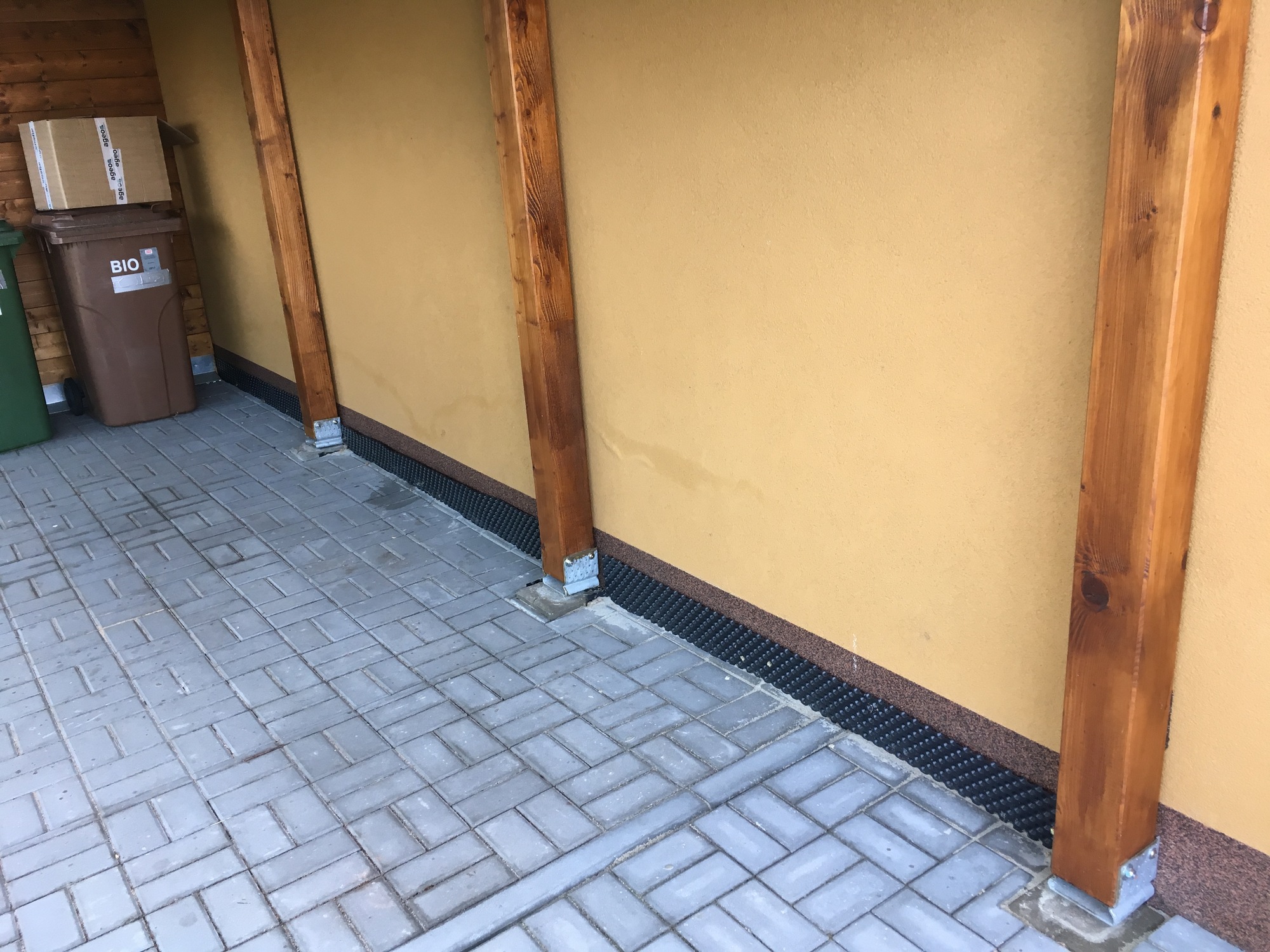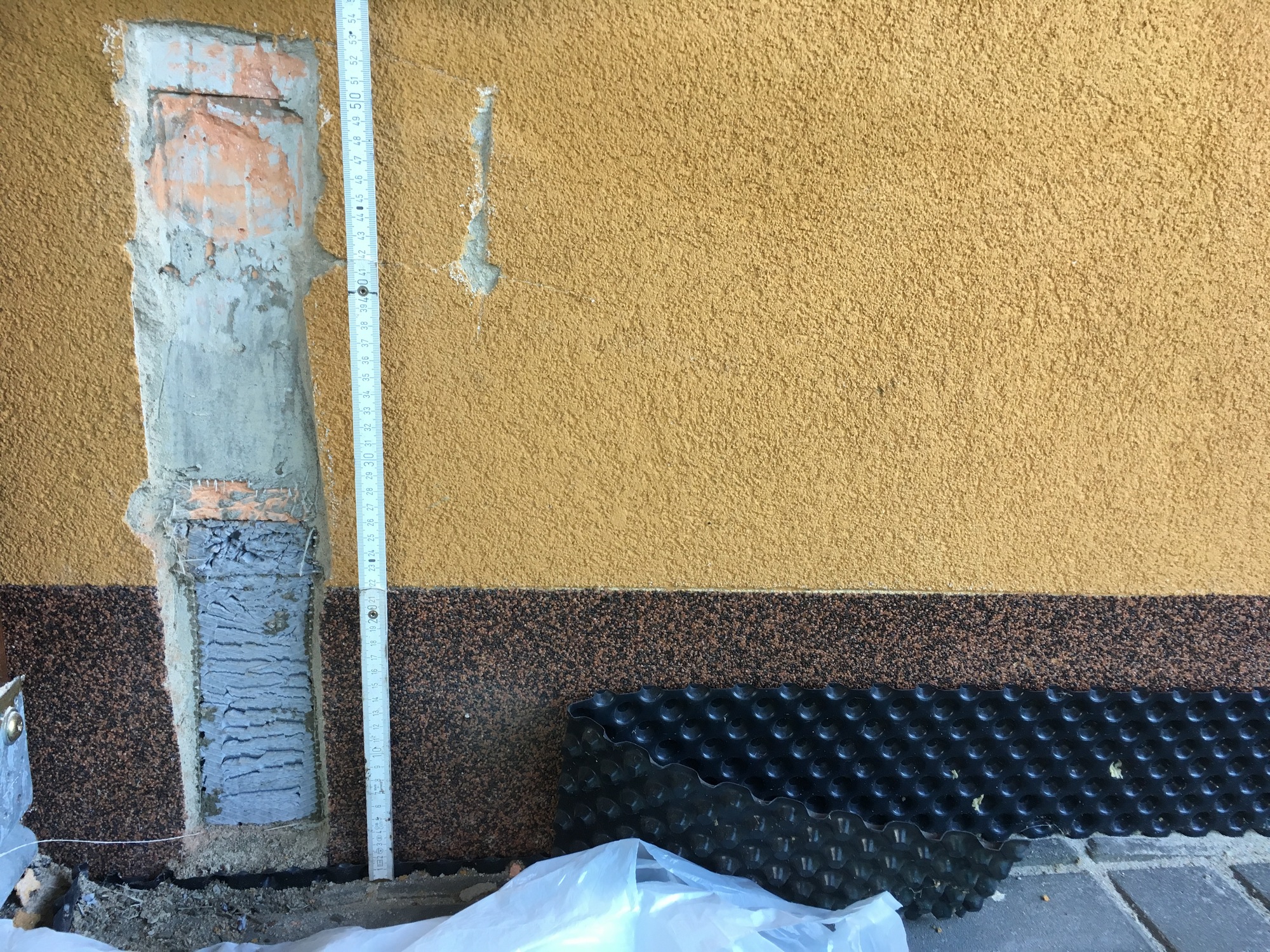 Již na první pohled bylo patrné, že zpevněné plochy mají lokálně spád směrem k domu. Mapy a puchýře v omítce se ale vyskytovaly převážně v místech, kde byl spád zpevněných ploch v pořádku. Z jedné strany k domu přiléhá přístřešek parkovacího stání, který chrání stěnu domu před srážkami. Přesto i pod ním se vlhkostní poruchy na omítce vyskytují. Bylo zjištěno, že dešťové svody ze střech jsou napojeny do lapačů střešních splavenin, dešťové odpadní potrubí vedoucí pod zemí do vsakovací jímky je však provedeno z flexibilního perforovaného potrubí. Dochází tak ke spolehlivému zavlažování obvodu stavby při každém dešti. Jak se ale voda dostane až do výšky přibližně 50 cm nad terén? Nemůže být zdrojem poruch voda rozlévající se po vodorovné hydroizolaci domu od netěsnosti některého z vnitřních rozvodů? Pro zodpovězení těchto otázek a bezpečné určení příčin bylo třeba provést destruktivní sondu v místě projevů poruchy.