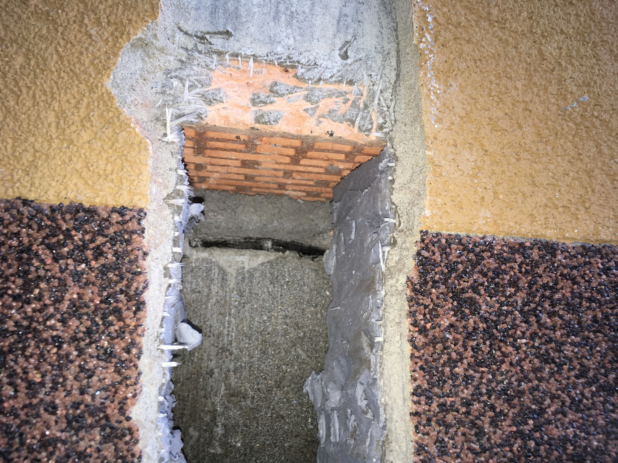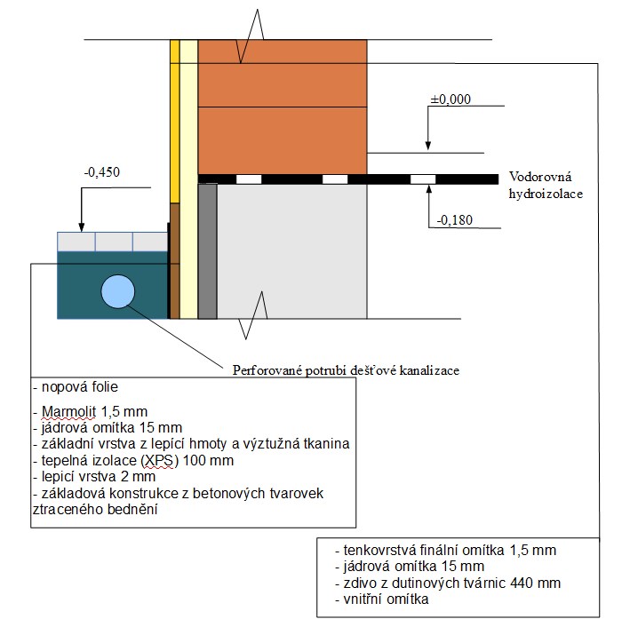 Sonda byla provedena na severovýchodní stěně pod střechou parkovacího stání. Poloha zřetelně viditelné vlhké mapy ve výšce 50 cm nad úrovní chodníku odpovídala poloze ložné spáry mezi 1. a 2. řadou cihel. Po odebrání tenkovrstvé finální omítky je v místě puchýřů viditelná usazená sůl na podkladní jádrové omítce. Zjistili jsme, že jádrová omítka tloušťky 1,5 cm byla provedena v celé ploše stěny a zatažena až pod úroveň terénu na izolaci soklu z extrudovaného polystyrenu s naneseným stavebním lepidlem. Základní vrstva na soklovém extrudovaném polystyrenu z lepící hmoty a výztužné skleněné síťoviny byla vlhká. Extrudovaný polystyren byl ve hmotě suchý, ale na vnitřním povrchu mokrý. Zakládací malta pro zdivo z dutinových cihel nad hydroizolaci byla také suchá. Povrch základové konstrukce po odhalení tepelné izolace byl mokrý. Zjištěná geometrie detailu je znázorněna na schématu.