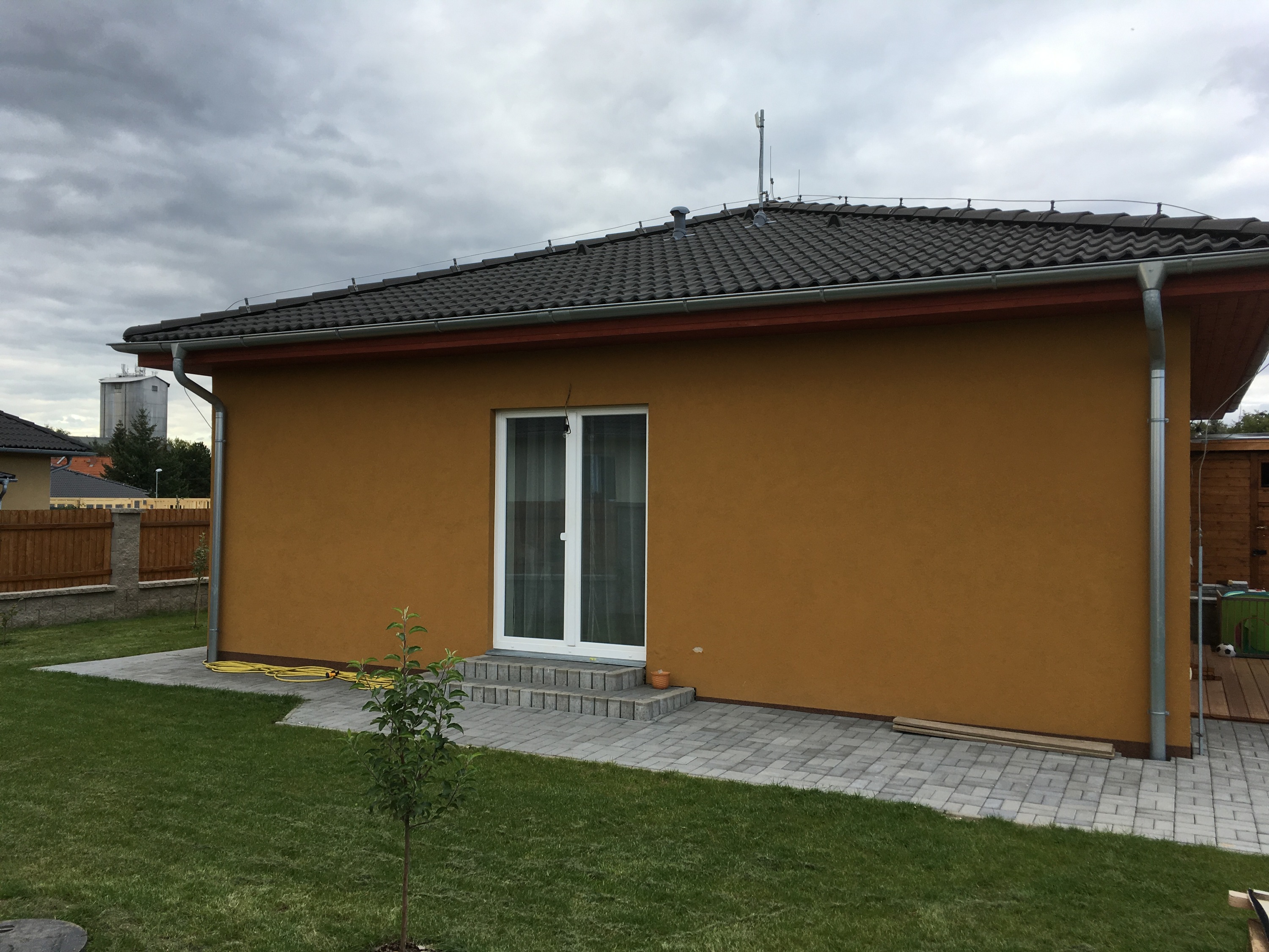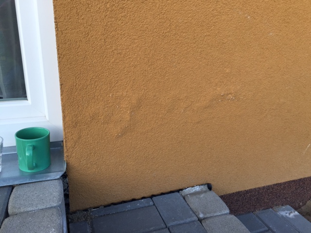 Zajímat nás bude povrch fasády přízemního nepodsklepeného bungalovu s vodorovnou hydroizolací nad úrovní terénu. Obvodové stěny jsou jednovrstvé z cihelných dutinových tvarovek bez přidané tepelné izolace. Sokl je zateplen extrudovaným polystyrenem. Kolaudace domu proběhla v roce 2014. Zpevněné plochy v okolí domu si provedl majitel svépomocí po kolaudaci.