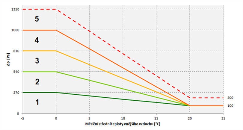 Vlhkostní třídy jsou charakterizovány přirážkou k venkovnímu částečnému tlaku vodní páry na základě měsíční střední teploty vnějšího vzduchu dle diagramu na obrázku č. 2.