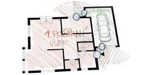Na obr. 1 je v půdorysu rodinného domu vyznačeno, kde zasahuje požárně nebezpečný prostor jednoho požárního úseku do zcela požárně otevřené plochy druhého požárního úseku. Dle nové Vyhlášky č. 23/2008 Sb. může celý objekt tvořit jeden požární úsek (včetně garáže). Nově tedy nebude nutné řešit požárně nebezpečný prostor od garáže jako od dalšího požárního úseku.