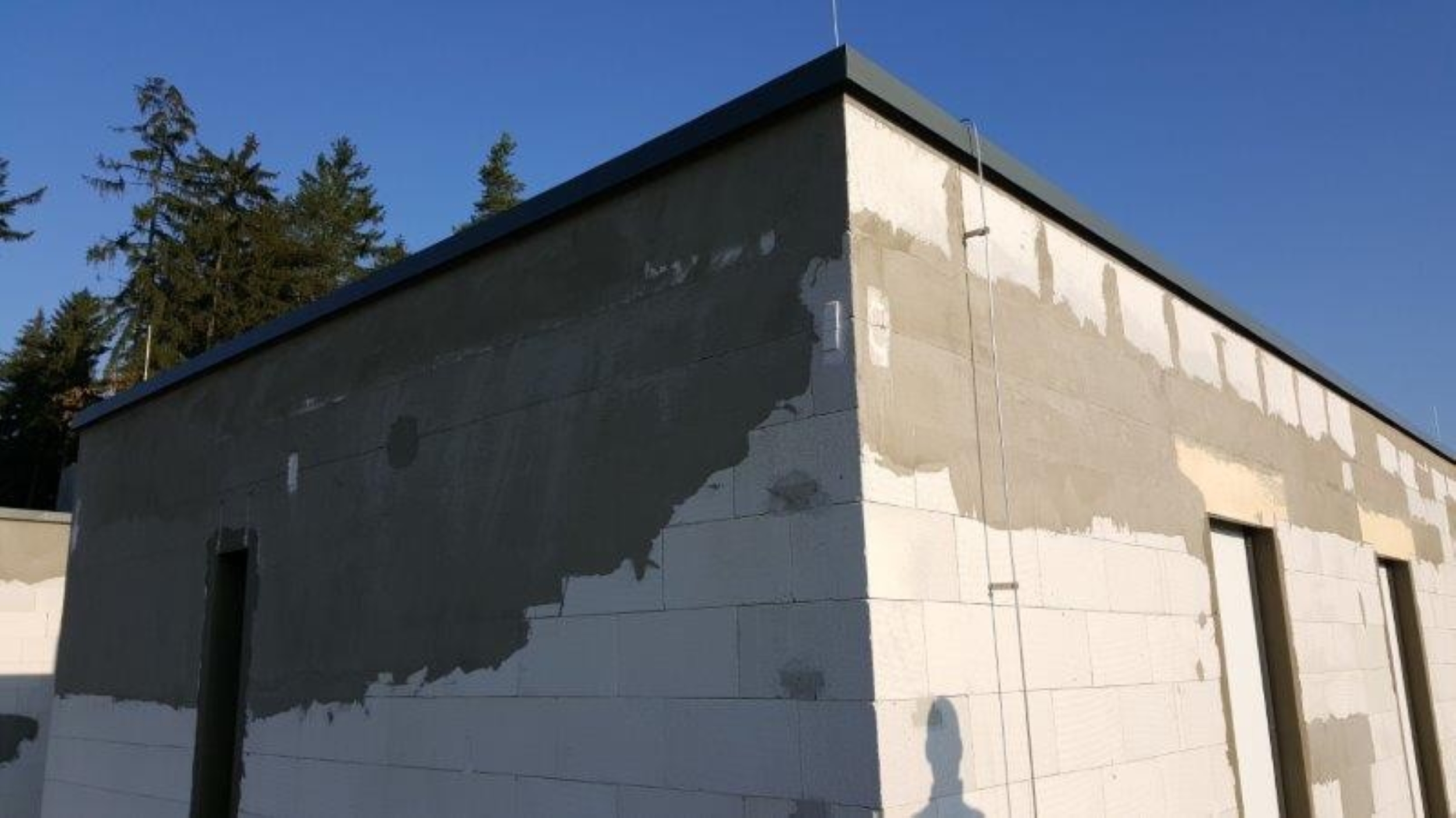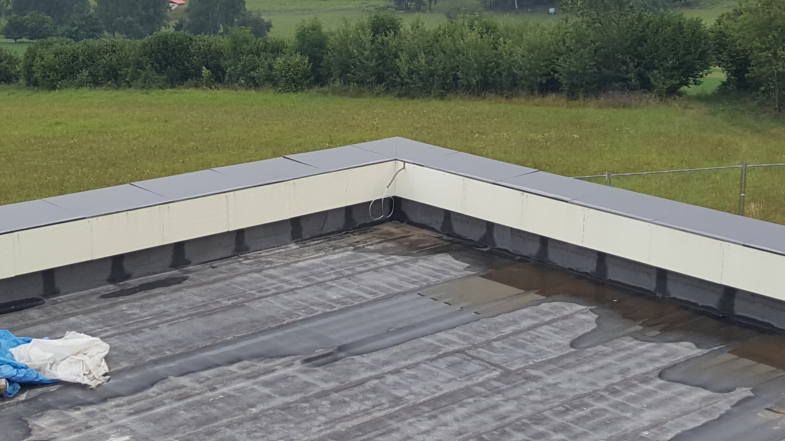 Při prohlídce hrubé stavby koncem července 2019 byly zjištěny vodorovné trhliny v čerstvé vnitřní omítce stěn pod nosnou konstrukcí ploché střechy (obr. /1/ a /2/). V době prohlídky byla ze skladby střechy provedena pouze provizorní hydroizolační vrstva z asfaltového pásu typu G200 S40 (obr. /3/), která měla poté ve výsledné skladbě střechy převzít parotěsnicí a vzduchotěsnicí funkci.