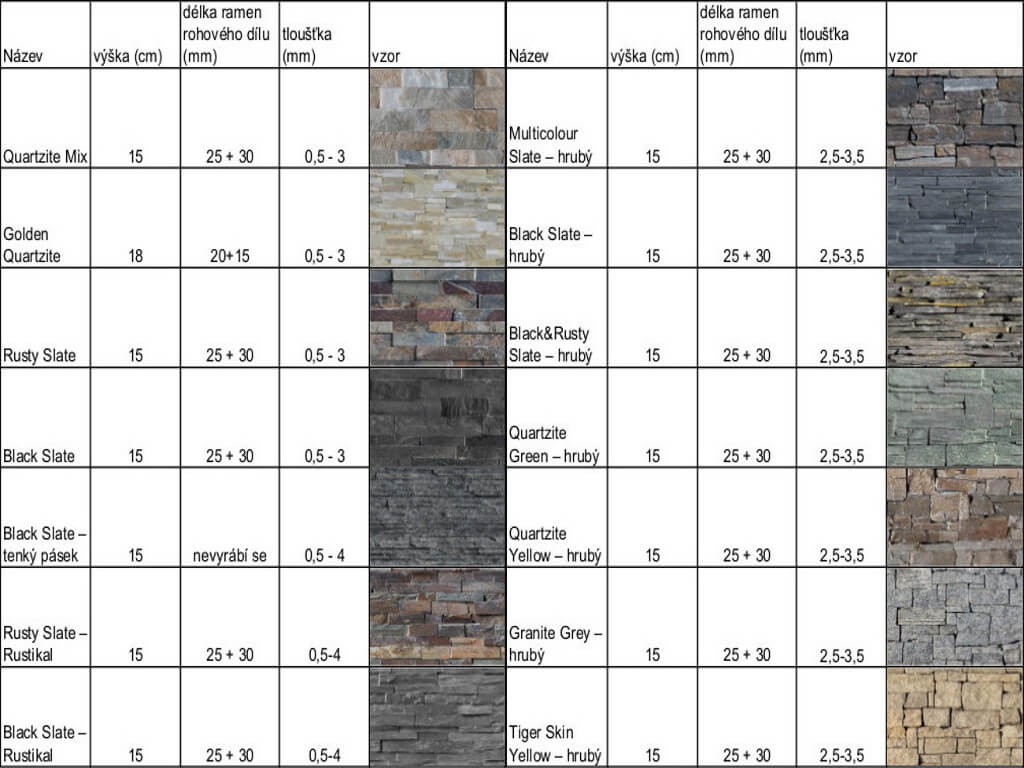 Wallstone je tedy obkladový materiál pro vnější i vnitřní povrchy staveb. Pro snadnost montáže se dodává ve tvarovkách tvaru “Z“ vytvořených z různě opracovaných a různě velkých kamenů ve třech základních materiálových variantách: granit (žula), quartzite (křemenec) a slate (břidlice). K dispozici jsou zároveň u většiny materiálových a vzhledových variant také rohové prvky. Tvarovky Z pro plochu mají šířku 55 cm a výšku 15 nebo 18 cm. Podrobnosti o rozměrech základních i rohových tvarovek spolu s ukázkami vzhledu obložené plochy jsou v tabulce 1. Provedení tvarovek je patrné z obrázků 1-3.