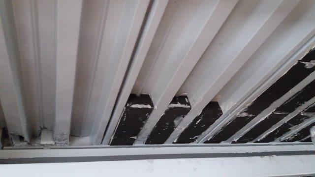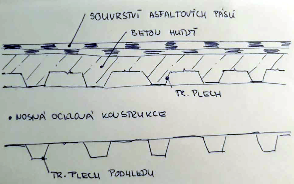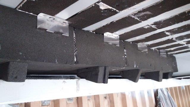 Spodní podhledový trapézový plech byl kompletně demontován. Celá ocelová konstrukce byla očištěna a opatřena antikorozním nátěrem. Mezi vlny horního nosného trapézového plechu byla vlepována na místě tvarovaná izolace z pěnového skla. K lepení pěnoskla k ocelovému plechu bylo použito dvousložkové lepidlo PC62. Lepidlem byly vymazávány i spáry mezi jednotlivými deskami. Následně byly (po potřebném vytvarování) lepeny další vrstvy desek pěnového skla Foamglas T3+. Tyto desky již byly kromě lepení fixovány nerezovými kotvami přistřelovanými do spodní vlny trapézového plechu.