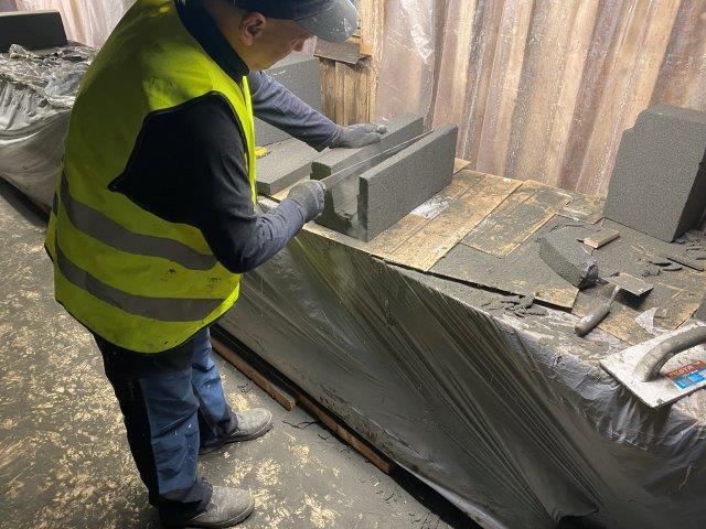 Tvarování desek z pěnového skla není obvykle fyzicky náročná činnost. Nejsou k ní potřeba speciální nástroje nebo nářadí, desky lze upravovat běžným ručním nebo elektrickým nářadím. Do jisté míry je třeba počítat s rychlejším opotřebením způsobeným tvrdostí materiálové báze desek – skla. V tomto případě však tvarování vyžadovalo takřka sochařskou práci a nekončící milimetrovou pečlivost při tvarování.