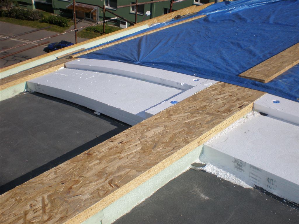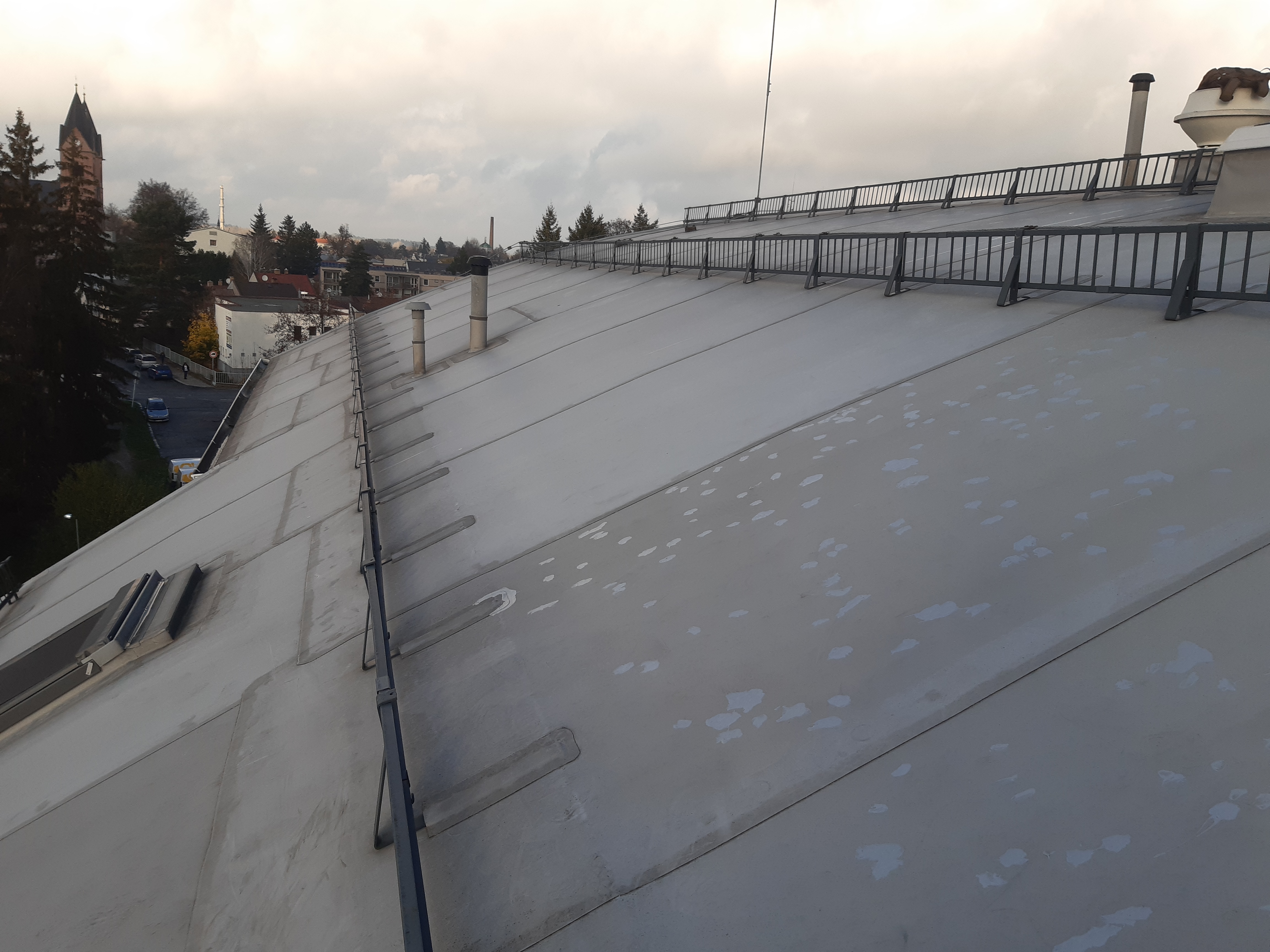 Vlhkostní stav celé střechy byl i přes zmíněné krátkodobé zatékání perforacemi od krup dobrý, po odstranění původní degradované PVC-P fólie mohlo být ihned bez dalších opatření přistoupeno k provedení nové povlakové hydroizolace z PVC-P fólie DEKPLAN 76 tl. 1,5 mm. Liniové kotevní pásy z OSB desek pro montáž sněhových zachytávačů navržené před 15 lety byly opětovně využity, kotevní vruty v nich držely velmi dobře. Zachován byl rovněž princip utěsnění tohoto kritického místa vč. převaření přířezem z PVC-P fólie. Tento zpětný pohled na konkrétní konstrukční detail s odstupem 15 let jasně ukazuje, že správně navržené řešení detailu v kombinaci s kvalitním provedením vede k dlouhodobé funkčnosti.