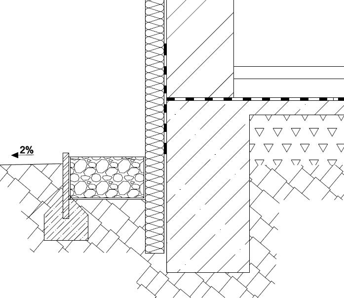 Svislá drenážní vrstva je zavedena do kameniva nad drenážním potrubím, čímž je zajištěno beztlakové předání vody do potrubí. Svislá drenážní vrstva je ukončena 150 mm pod úrovní terénu tak, aby bylo vyloučeno přivádění povrchové vody nebo vody z fasády do obvodové drenáže.