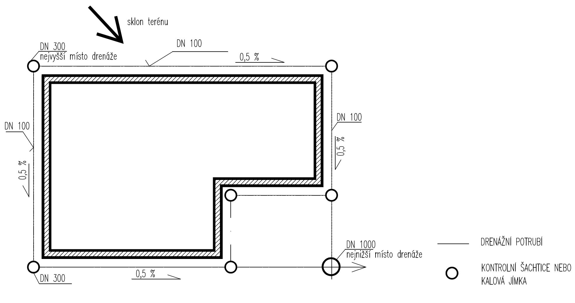 V příznivějších geologických podmínkách a v nejnižší části svažitého terénu je pak vytvořena jímka s hloubkou minimálně o 0,50 m větší než je hloubka uložení drenáže. Jímka je vyplněna kamenivem. Potřebnou velikost jímky je možné určit orientačním výpočtem podle vzorce: